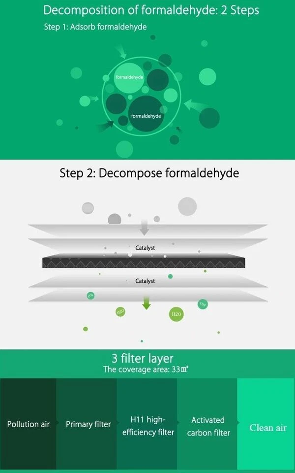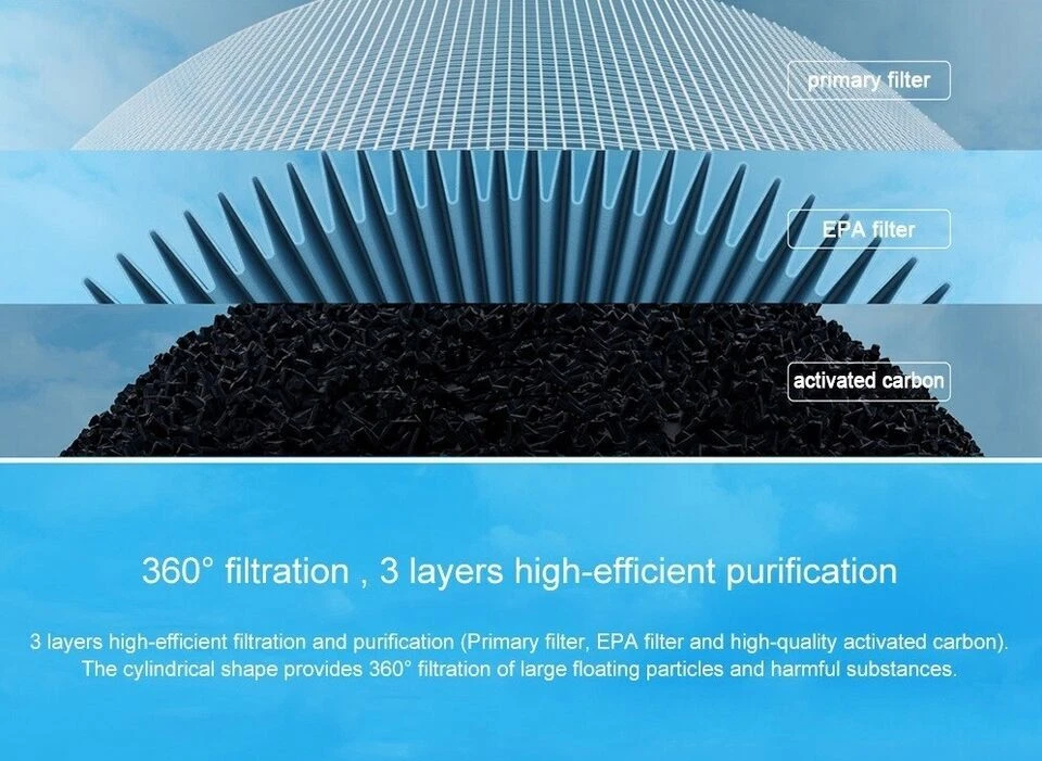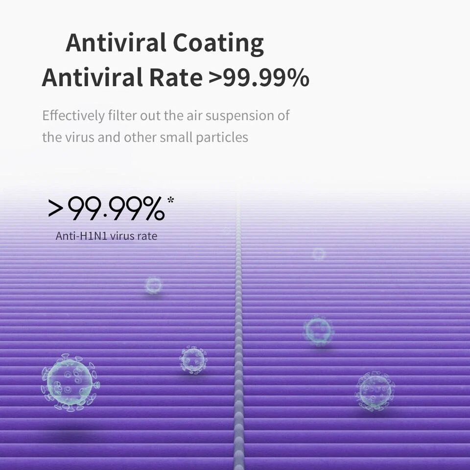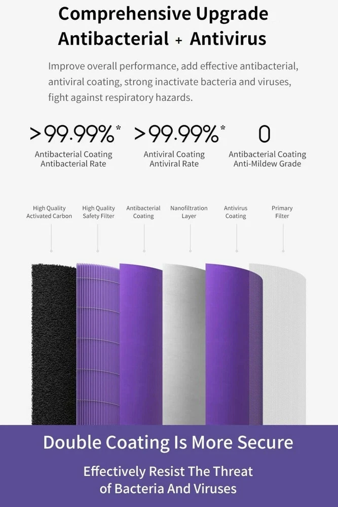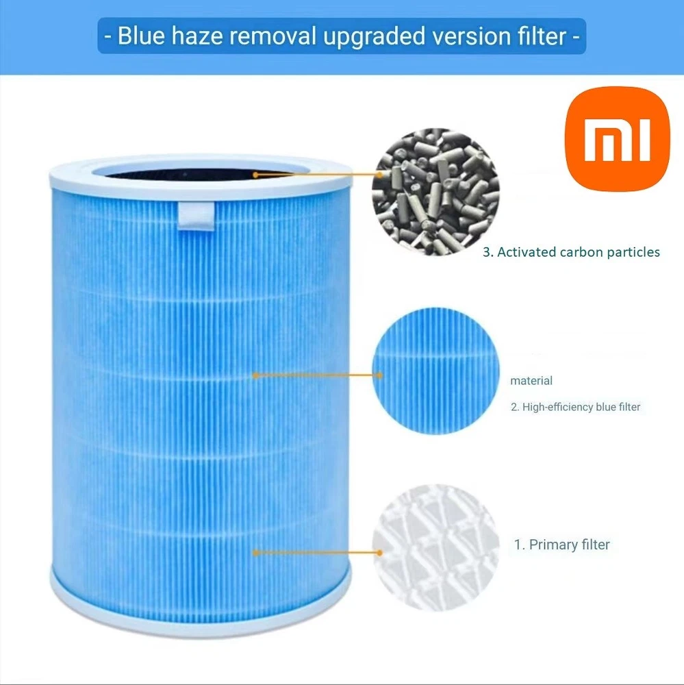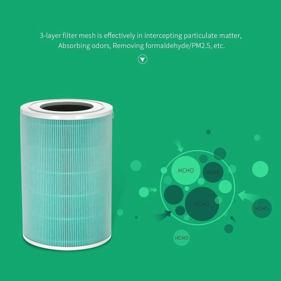 G enuine Xiaomi Smart Mi Air Purifier Original Replacement Filters (Worldwide Free Shipping!) This Xiaomi Mi filter is Suitable for Xiaomi OLED Display Smart Air Purifier 2S / Xiaomi Mi Air Purifier 1 / Xiaomi Mi Air Purifier 2 / 2H / 2C / 2S/ Xiaomi Mi Air Purifier 3 / 3H and Xiaomi Mi Air Purifier Pro model (NOT SUITABLE FOR "PRO H" model). The Mi filter comes with the RFID chip at the bottom of the filter, which is essential to communicate with the APP. (The other cheap non-genuine replacement filters does not include this essential chip). Our optional comes 4 available original filters for your Xiaomi air purifier: Blue: there are 1 ), standard filter consisting of 2 layers, or 2 ), Upgrade version has 3 layers (primary filter for large particles, HEPA filter for fine particles and pollens, and activated carbon to eliminate bacteria, viruses, etc). Green : is a more efficient filter that can also remove formaldehyde, benzene, and ammonia. The H11 grade HEPA filter retains 99% of the PM0.3 class and 99.99% of the PM2.5 class. The green filter is also more effective at eliminating odors like cigarette smoke. Purple : It has the same efficiency as the Green filter + Has an anti-bacterial, anti-viral coating that eliminates bacteria and airborne pathogens. It is the most suitable for bacteria season, unventilated room, and stream of a closed environment. 360° filtration, 3 layers high-efficient purification It contains 3 layers of high-efficient filtration and purification (Primary filter, EPA filter, and high-quality activated carbon) The cylindrical shape provides 360° filtering of large floating particles and harmful substances. Primary filter It has high flexural strength and is resistant to folding, grease, fats, acids, alkalis and most solvents. The cylindrical shape provides 360° filtering of dust, hair and other larger floating particles. EPA filter HEPA (High-efficiency Particulate Arrestance) is frequently used in hospitals and labs to filter out micron-sized particles. Mi air purifier filter uses an ultra-dense Toray PP to trap PM2.5, PM0.3, pollen and other inhalable particles. The HEPA filter of the Xiaomi Air Purifier is capable of removing 99.9% of the fine particles (PM2.5) but also the bacteria, heavy metals, viruses, formaldehyde present in the atmosphere. Quality coconut activated carbon Activated carbon absorbs harmful gasses that HEPA is unable to filter. Mi Air Purifier's coconut activated carbon is among the most effective of its kind. Absorbs all kinds of odors and harmful substances Mi Air Purifier's coconut activated carbon filter absorbs hundreds of harmful substances in these situations, keeping your home clean and your family healthy. Real-time usage monitoring All filters lose effectiveness over time and must be replaced promptly. Filters not replaced on time may not be able to block harmful substances or may cause secondary contamination. Contrary to what others may advertise, cleaning old filters with water or a vacuum cleaner does not guarantee that the filter will regain its effectiveness. It is recommended to replace the filter every 6 months or less, depending on your usage. Use the Mi Home app to monitor filter lifespan and receive notification reminders whenever your filter needs replacement. To be certain of the effectiveness of your Air Purifier, it is best to buy original filters.