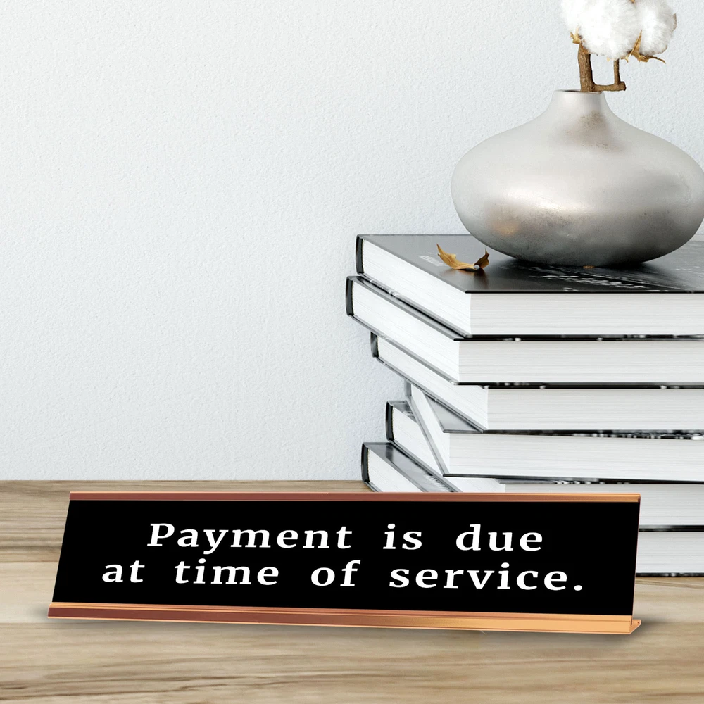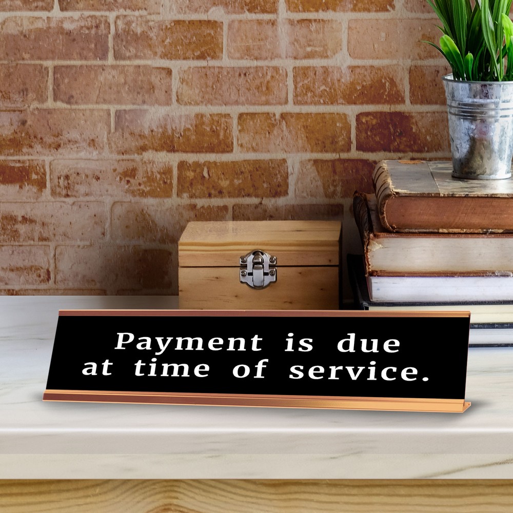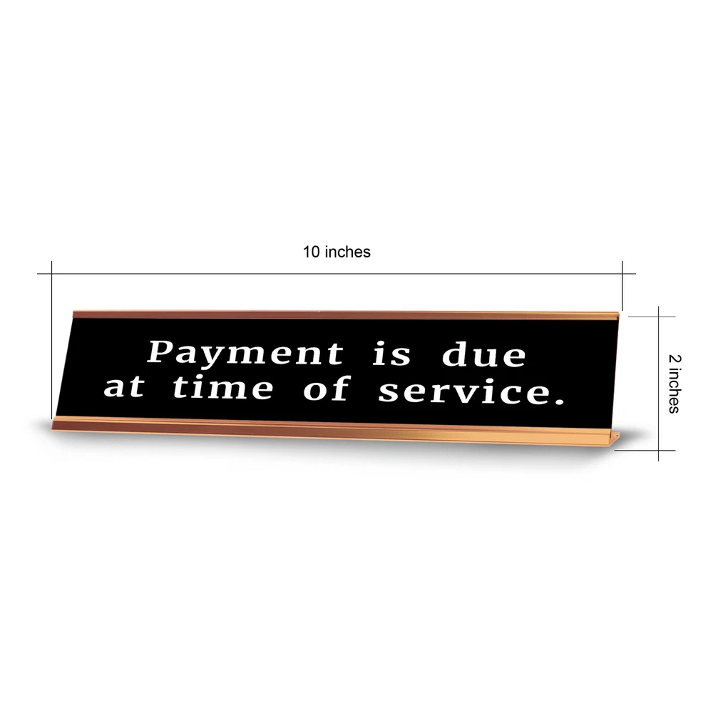 Signs ByLITA Novelty Desk Sign Nameplate "Payment Is Due At Time Of Service.". Fun novelty desk sign gift idea for friends, family colleagues, bosses, managers and more. The premium sublimated plastic nameplate comes with a sturdy colored aluminium frame. Great for home or office funny desk sign. Fun novelty desk sign gift idea friends, family colleagues, bosses, managers and more. Comes with a Sturdy Colored Aluminium Frame. Premium Sublimated Plastic 2 x 10" Desk Plate Fun Desk Sign idea for your office