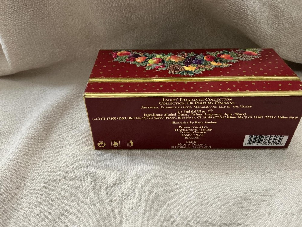 New Penhaligon’s Quercus eau de toilette, 0.5 fl oz (15ml). I’m including the box of used Penhaligon’s ladies perfumes- Elizabethan Rose is empty, Lily of the Valley has a very small amount. I can’t tell which is which of the other 2 bottles- 1 is half full, and 1 is full.
