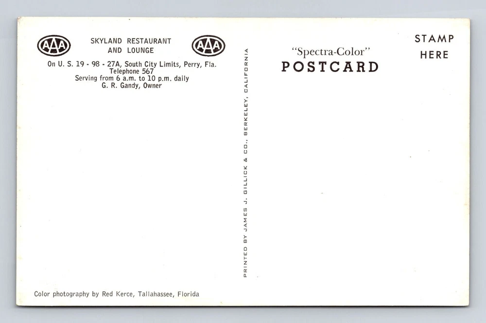 Perry FL-Florida, Skyland Restaurant And Lounge, Antique, Vintage Postcard