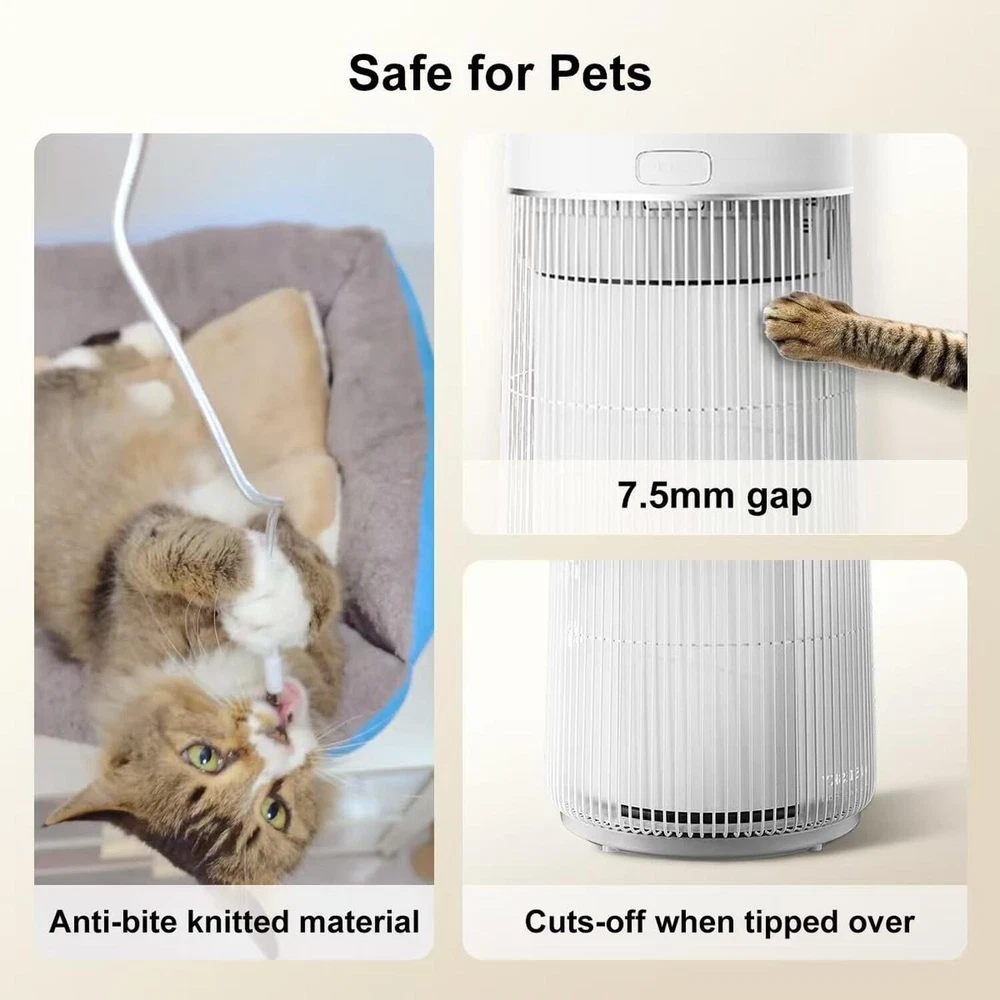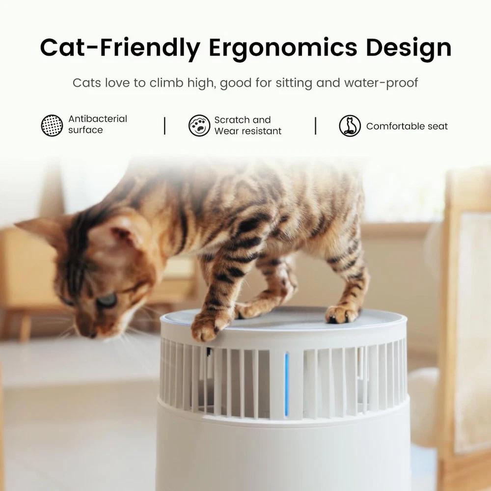Pet Air Purifier, 3-in-1 HEPA Filter for Cat Hair Dander Odor Dust, Quiet 360° Air Intake Large Room Air Cleaner Covers Up to 1644 Ft², with Smart APP Control, W-Cat Model POWERFUL PET HAIR ADSORPTION - W-Cat prefilter captures pet hair, dust, and dander with ease. Its unique 360° visible wide grille inlet with a spoiler pattern quickly sucks in floating dander, keeping your home clean and comfortable. Cat hair adsorption filters can be torn out and replaced with new ones PET-FRIENDLY DESIGN - Bite-proof power cord, 24v low voltage and automatic power-off function when 45° tipped off. The three-color light could be turn off easily at night, and 7.5mm gap prevent cat's paw from getting stucked. These features provide extra safety, giving you peace of mind knowing your feline friends are protected QUIET MODE FOR BETTER SLEEP - Fixed speed mode doesn’t frighten pets. The quiet mode ensures that both you and your furry friends enjoy peaceful, undisturbed sleep at night EFFICIENT ODOR REDUCTION- Hepa air purifier advanced filtration system reduces 99.97% of 0.1-micron particles, including cat hair and other tiny particles. It effectively breaks down PM2.5, PM10, and VOCs. The high-efficiency activated carbon filter absorbs smoke, pet odors, and cooking smells, ensuring your home's air stays fresh and clean SMART AIR QUALITY MONITORING - PM2.5 and TVOC sensors monitor indoor air quality 24/7. The three-color air quality indicator shows real-time AQI, helping you keep track of the air quality in your home and ensure a healthy environment for your family, and our smart app can help you monitor at anytime anywhere Product Dimensions 11.65"D x 11.65"W x 21.5"H Specification Met FCC Certified, CARB Certified, EPA Certified Noise Level 23 dB
