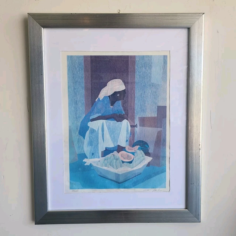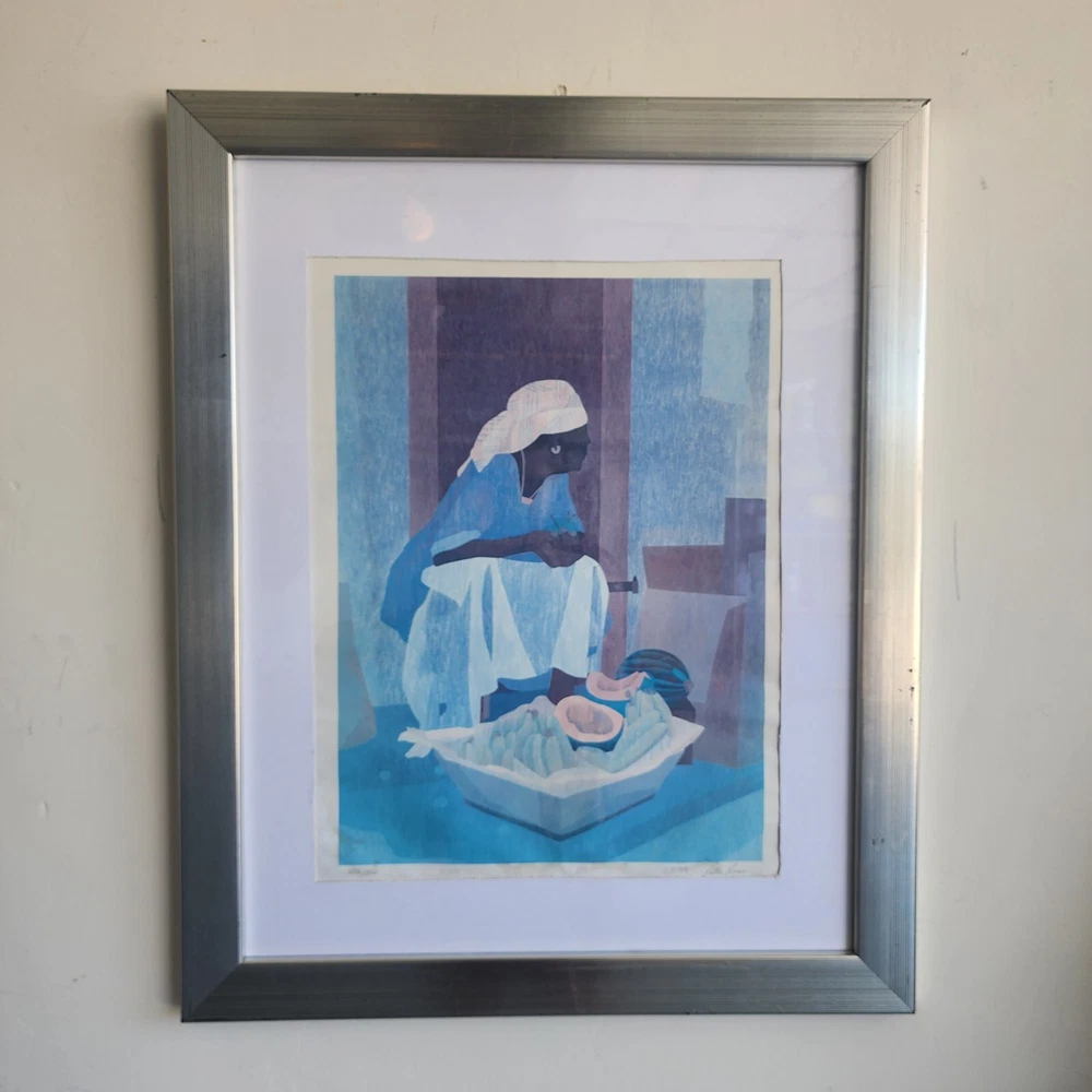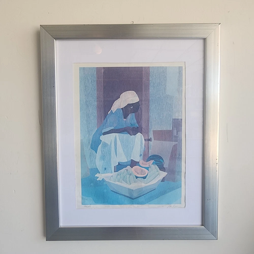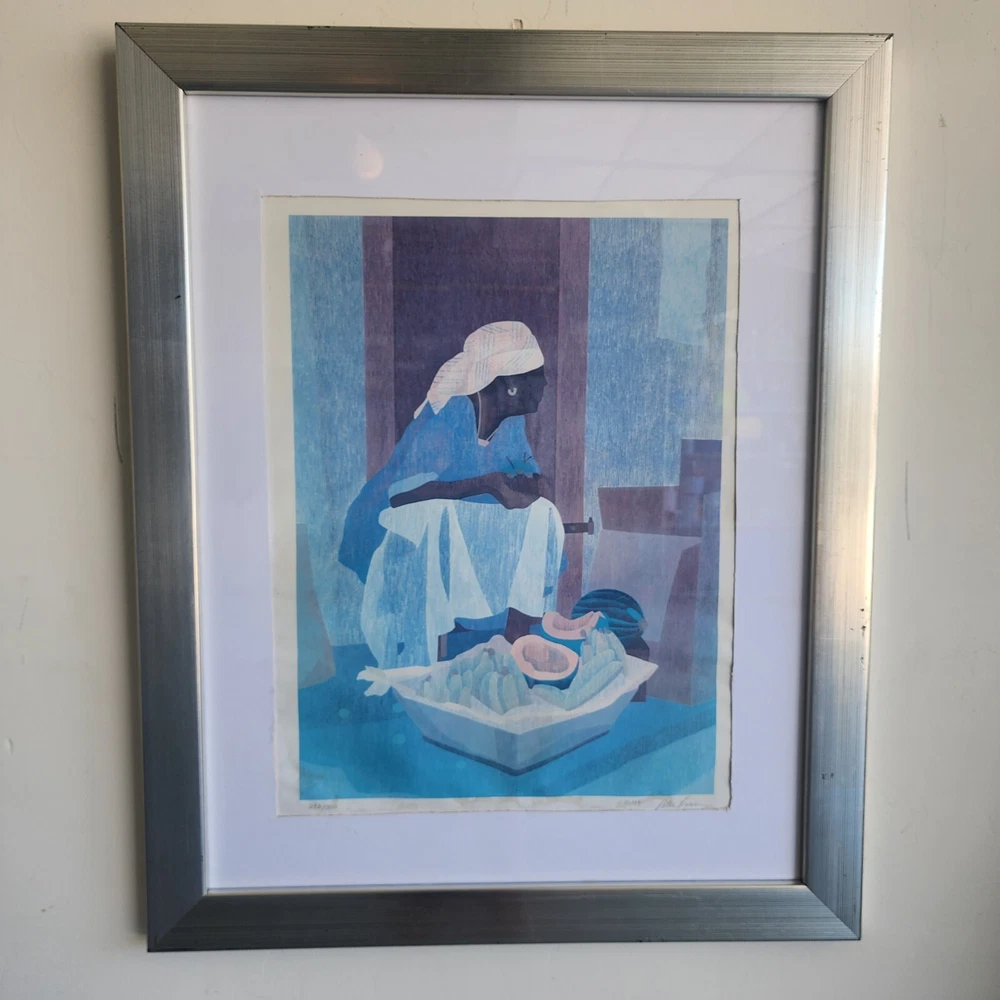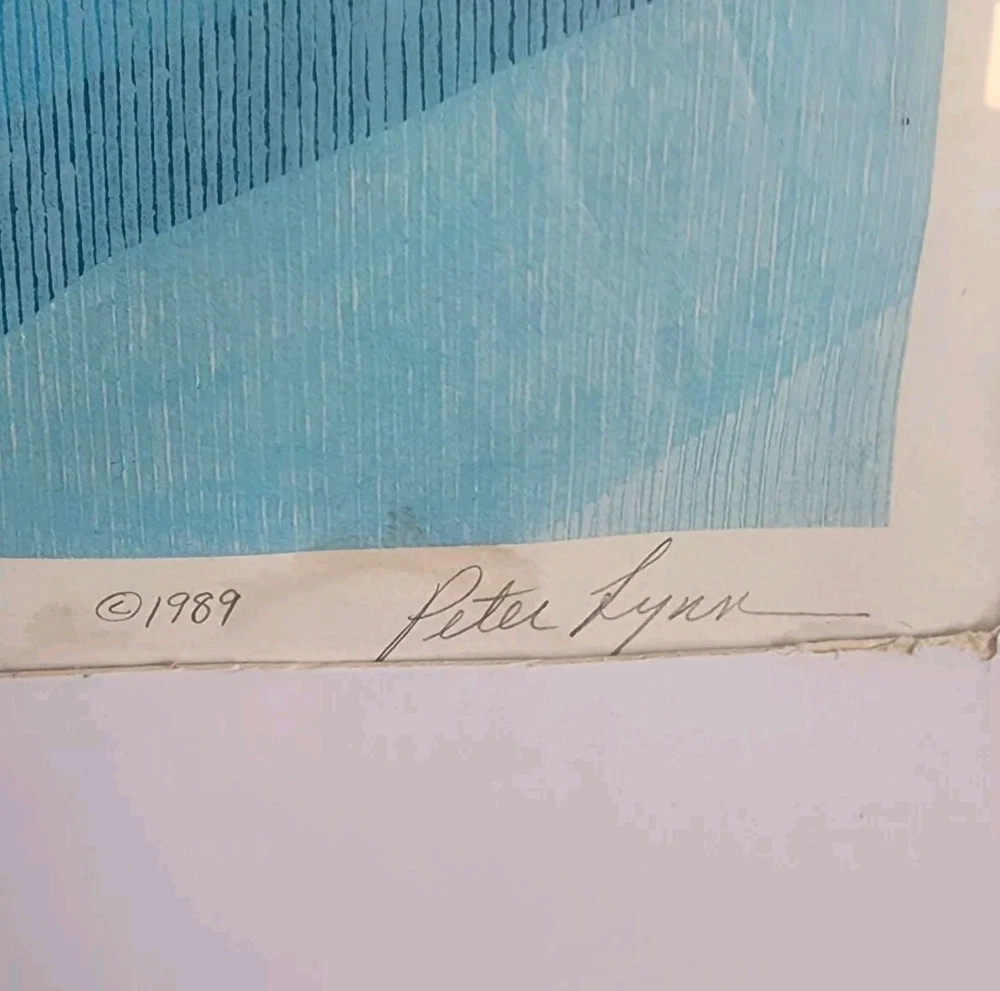 This 1989 silkscreen serigraph print signed and numbered by Peter Lynn, is titled "Marketplace." This print is framed and measures 32"x26." Note that there is minor water damage at the bottom of paper, as seen in the photos. Living in such diverse places as the Lower East Side and SOHO in Manhattan NYC, the Caribbean FWI, and finally in Santa Fe, NM, Peter Lynn has been inspired by local culture, architecture and landscape. He began to incorporate these subjects into his art, while still maintaining his distinctive technique and abstract view. Lynn's technique is to first apply layers of color (underpainting) and then cover the entire surface with thin, vertical, hand-painted lines of varying opacity. The resulting image is one of unique interplay between color, light and texture. Using architecture and landscape as a design format, the underpainting becomes more involved with the introduction of highlight and shadow, gradients and variation of color. This underpainting technique shows a more traditional view of the subject, but with a definitely non-traditional color rendering. Lynn's works are included in many private, corporate and public collections. He has been represented in art galleries throughout the United States, the West Indies, U.S. Virgin Islands, Puerto Rico, Canada and Europe. In 2020, three of his paintings were added to the collection of a premier Caribbean island hotel. Peter Lynn has also received the Award of Excellence. (The artist's bio was taken from https://www.peterlynnstudio.com/