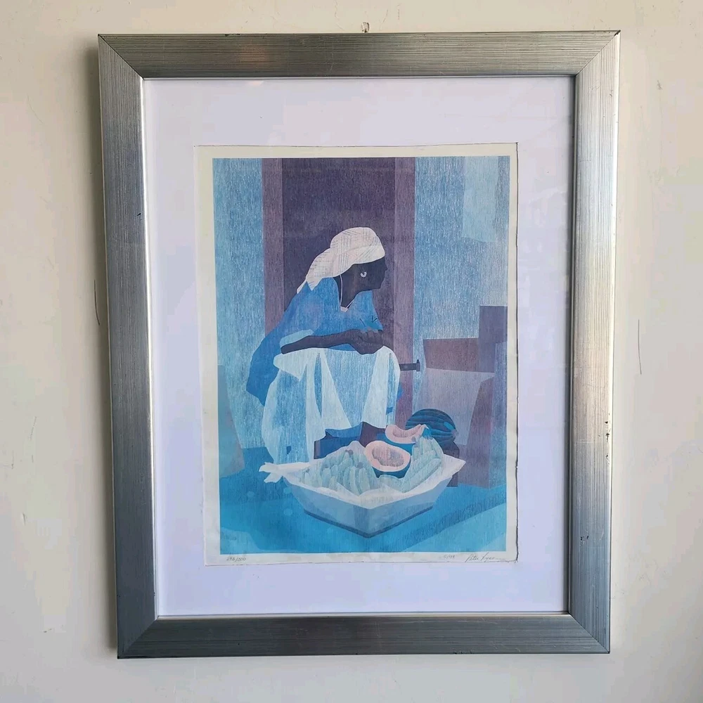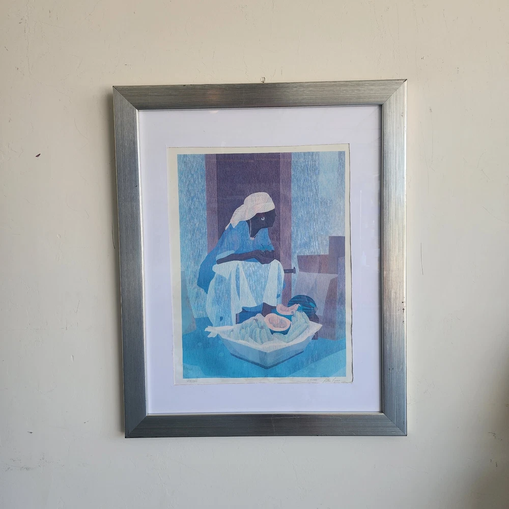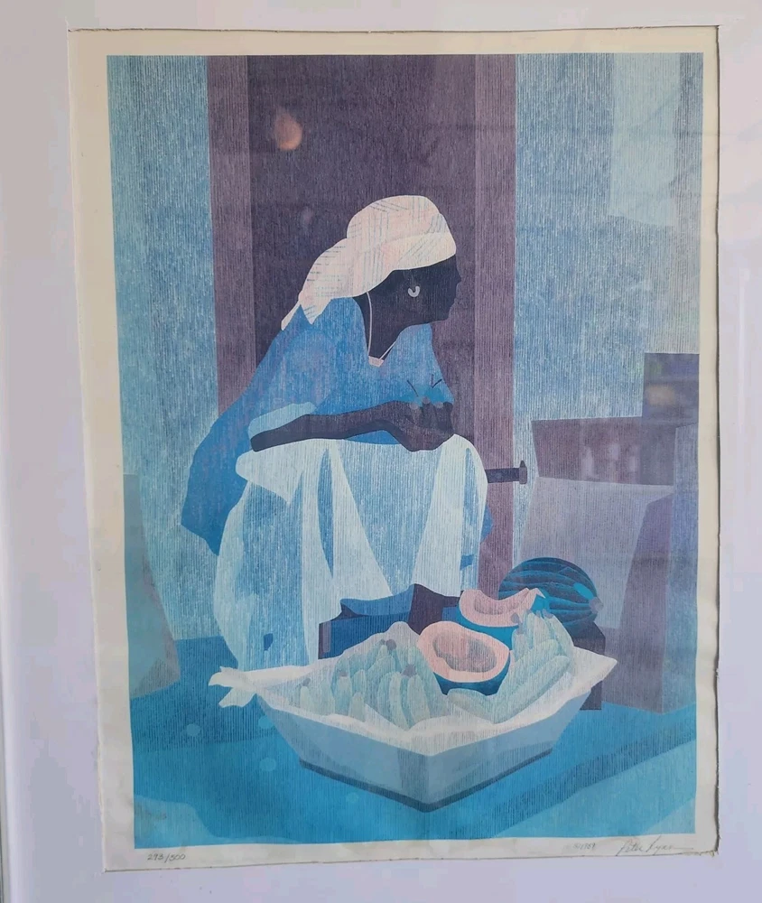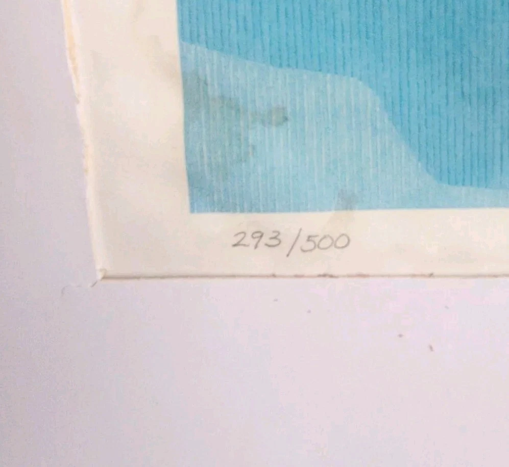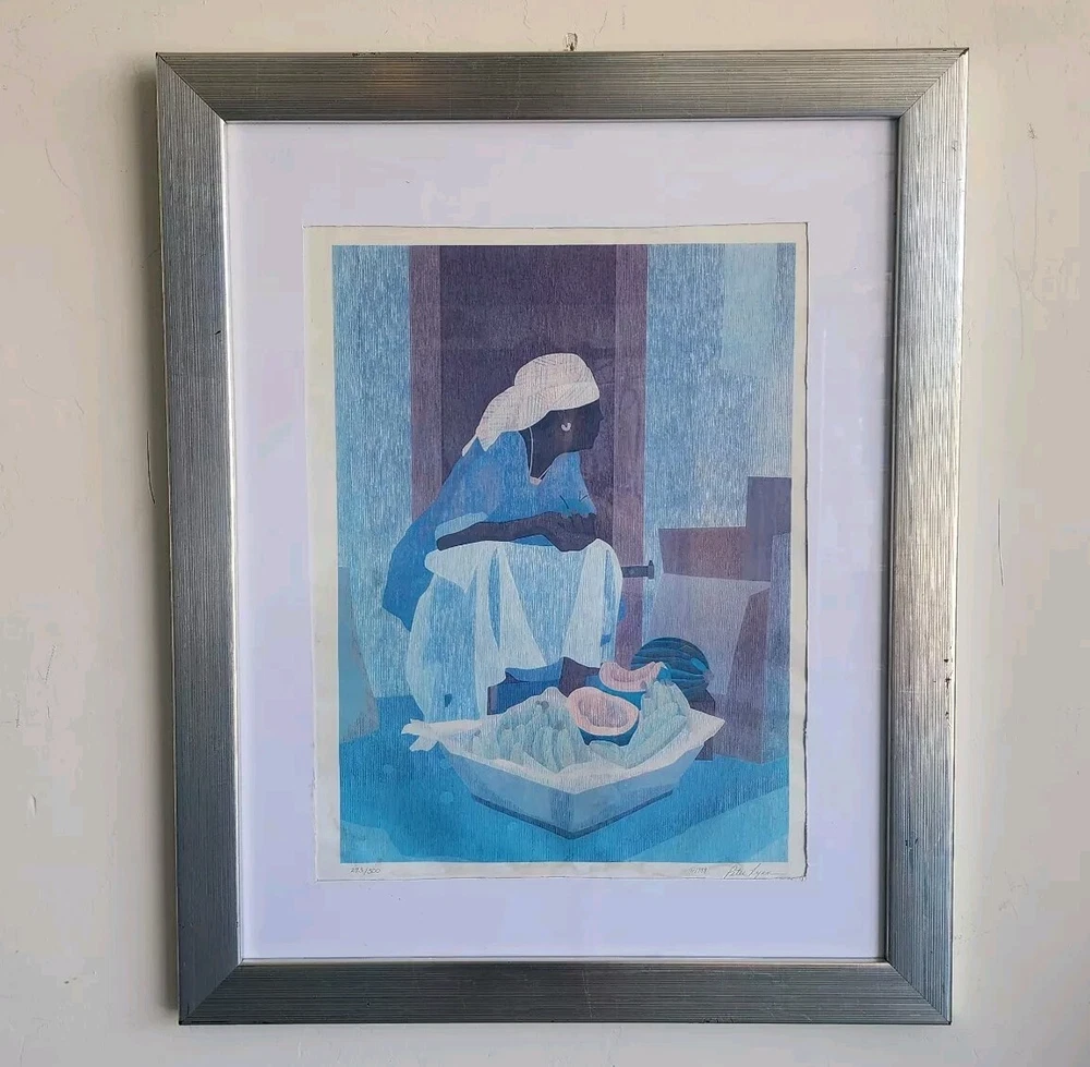 This 1989 silkscreen serigraph print signed and numbered by Peter Lynn, is titled "Marketplace." This print is framed and measures 32"x26." Note that there is minor water damage at the bottom of paper, as seen in the photos. Living in such diverse places as the Lower East Side and SOHO in Manhattan NYC, the Caribbean FWI, and finally in Santa Fe, NM, Peter Lynn has been inspired by local culture, architecture and landscape. He began to incorporate these subjects into his art, while still maintaining his distinctive technique and abstract view. Lynn's technique is to first apply layers of color (underpainting) and then cover the entire surface with thin, vertical, hand-painted lines of varying opacity. The resulting image is one of unique interplay between color, light and texture. Using architecture and landscape as a design format, the underpainting becomes more involved with the introduction of highlight and shadow, gradients and variation of color. This underpainting technique shows a more traditional view of the subject, but with a definitely non-traditional color rendering. Lynn's works are included in many private, corporate and public collections. He has been represented in art galleries throughout the United States, the West Indies, U.S. Virgin Islands, Puerto Rico, Canada and Europe. In 2020, three of his paintings were added to the collection of a premier Caribbean island hotel. Peter Lynn has also received the Award of Excellence. (The artist's bio was taken from https://www.peterlynnstudio.com/