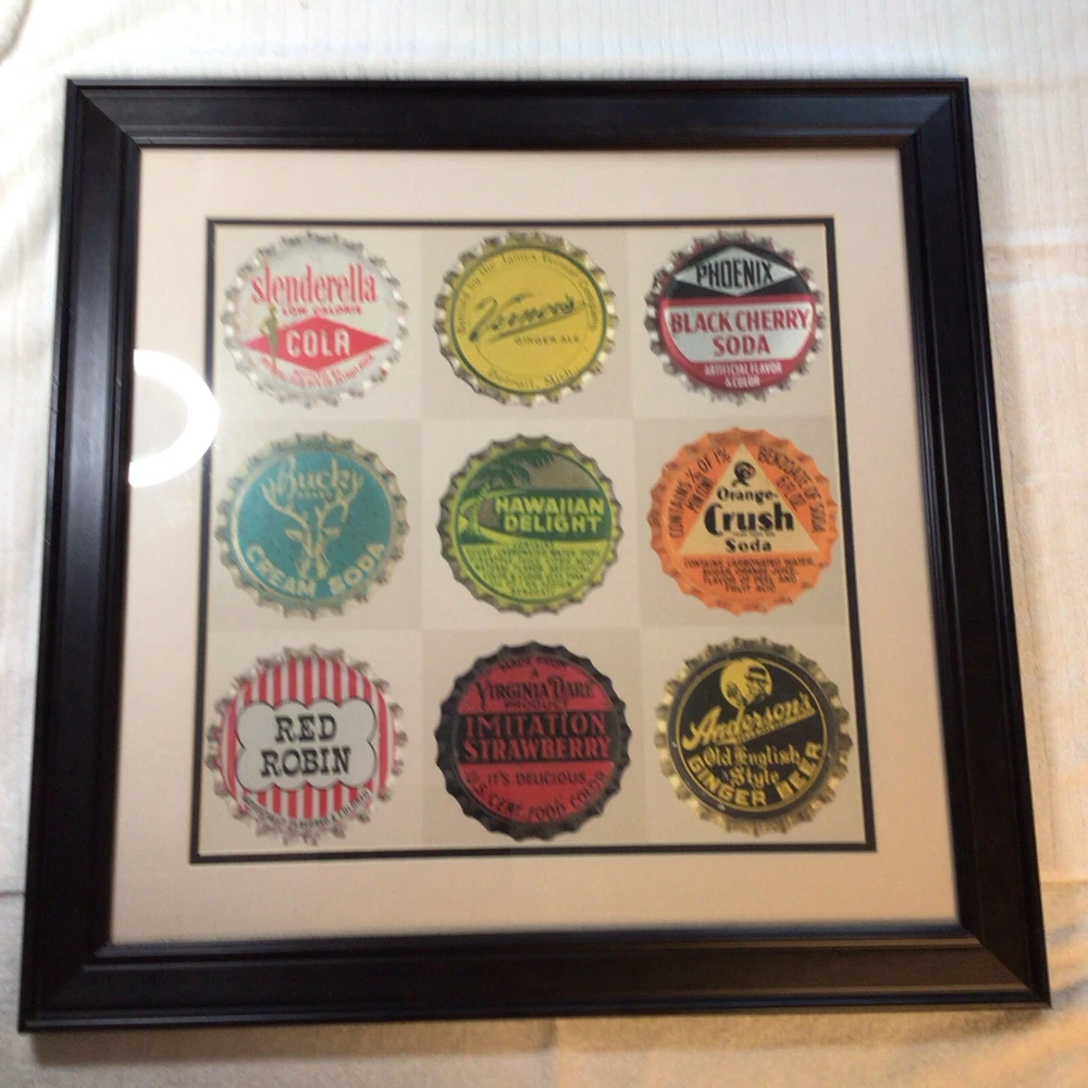 This beautiful giclee print titled "Pop Bottle Tops II" is a stunning piece of art that captures the essence of American culture. The artwork features a colorful depiction of soda bottle caps, which adds a touch of nostalgia to any room. The print is matted and framed, making it ready to display upon arrival. The piece measures 23 inches in both height and length, and is made of high-quality paper. The artwork is perfect for those who love art deco style, Americana, and pop culture. Don't miss your chance to own this unique and captivating piece of art. Nice piece with dark frame. The back has some stains and blemishes but doesn’t affect the print or frame. Please look at the pictures closely, as this is the item that you will receive.