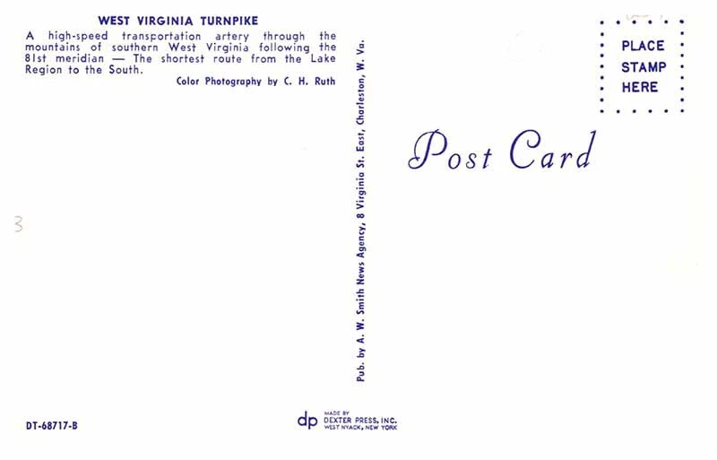 Country: USA Continent: North America Subject: Highway Region: West Virginia Country/Region of Manufacture: United States Era: see features for era Type: Printed (Lithograph) Original/Licensed Reprint: Original Unit of Sale: Single Unit Material: Paper Size: Standard (5.5 x 3.5 in) Postage Condition: n/a