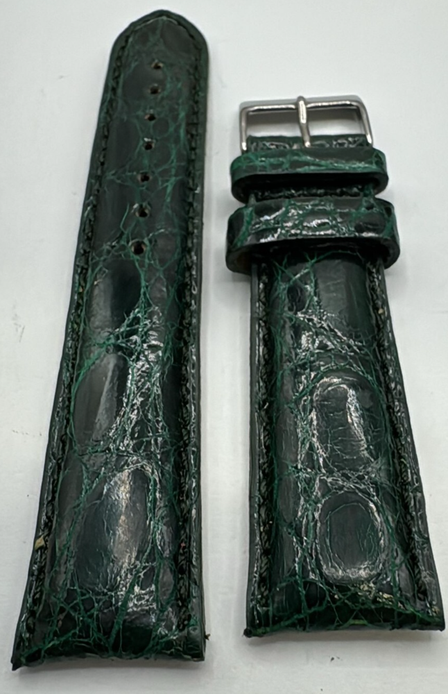 Pregiato cinturino vero coccodrillo mm20/18 verde scuro handmade in Italy imbottito mm20 attacco cassa, mm18 fibbia. Quest'ultima a scelta inox, gialla, rosè (segnalare la preferenza) Il cinturino potrà su richiesta essere marcato con il logo dei maggiori brand (non c'è sovrapprezzo) Lunghezza standard 11.5x7.5cm; imbottitura 5-3.5mm Fornito con anse per il montaggio