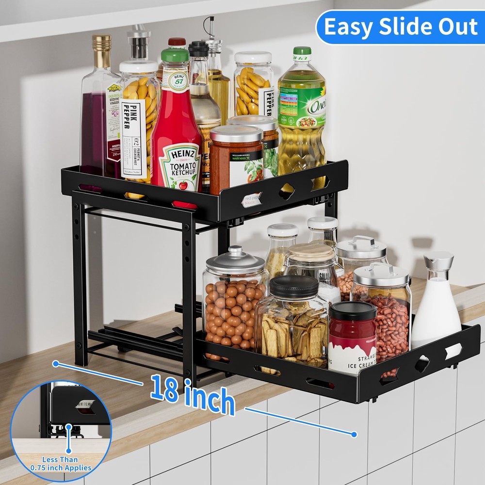This 2-tier cabinet pull-out spice rack is an ideal spice organizer for kitchen cabinets. With dimensions of 11.9 inches in width, 10.8 inches in depth, and 9.2 inches in height, it can easily hold spice bottles of various sizes and shapes, allowing you to conveniently store and organize all your spices. The slides are designed with a ball-bearing system to ensure smooth and quiet operation. The full-extension slides allow you to easily access all the spices in your cabinet, making cooking a breeze. Made of high-quality metal, the spice rack is rust-resistant and not easily deformed. The independent slide design allows the upper and lower baskets to move independently, making it easy to quickly find and reach the spices you need. The top basket is height adjustable, perfect for storing tall spice bottles such as olive oil and flaxseed oil, providing ample organizing space for all your spices and keeping your cabinets neat and tidy. Installation is very simple, requiring at least a 13-inch wide and 12-inch high cabinet space. No assembly experience is needed, and it can be installed in just two easy steps. It is compatible with both cabinets with and without edge lips. Spice Rack: 2 tier pull out spice rack organizer for cabinet is for kitchen cabinets, increase cabinet storage space. Spice rack organizer size 11.9''Wx10.8''Dx9.2''H. As spice spice for cabinet, they can hold spices of various sizes and shapes. Allows you to easily access and organize all your spice bottles. Note: Jars not included. Smooth Sliding and Quiet Slide Out: The slides are designed with a ball bearing system to ensure that the cabinet spice organizer are smooth and steady during sliding, with no noise at all. The full extension slides allow you to easily access all the spices in your cabinet. Let you enjoy cooking food completely. Quality Metal and Independent Slides: The spice rack made of high quality metal, not easy to deform the surface is painted to prevent rusting. Shelf design, spice jars will not tip over or fall out of the basket when the spice rack slide out. Ensure spice jars are neatly arranged. The upper and lower baskets slide independently of each other, making it easier to find and reach the spices. Wide Use: Spice racks for inside cabinets storage variety of sizes of spice jars and bottles, perfect for storing spices, seasoning grinds, grains, canning jars, salt and pepper grinders and more. The top basket is height adjustable for storing tall bottles of spices such as olive oil and flaxseed oil. Provide enough organizing space for all your spice storage, cabinets are not cluttered. Easy to Assemble and Install: Our spice shelf organizer for cabinet it requires at least 13'' wide x 12''high cabinet space. Please measure your cabinet first. No assembly experience required, assembles in 2 easy steps. Note: Cabinets with edge lip! Cabinets without edge lip! Works for both 2 kinds!