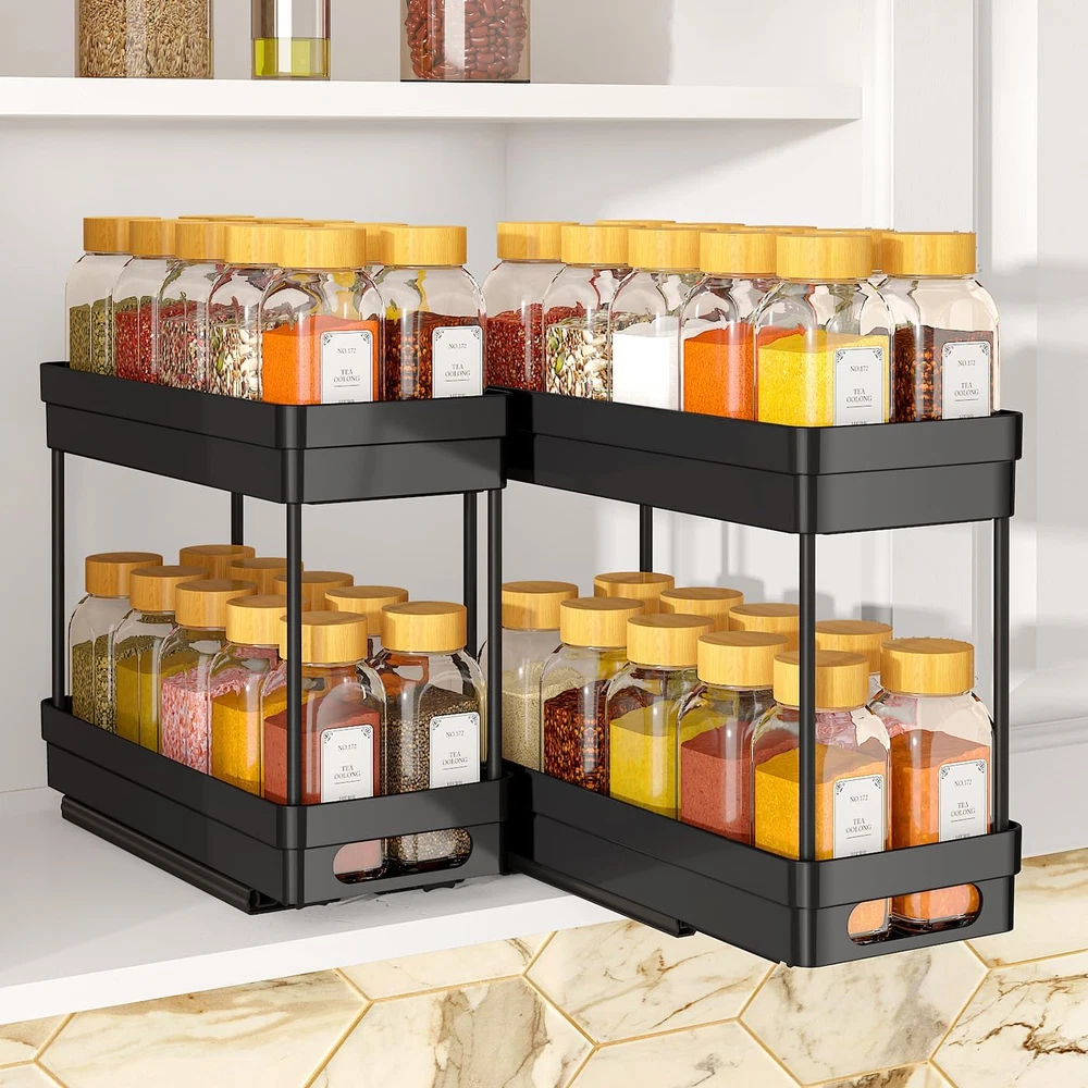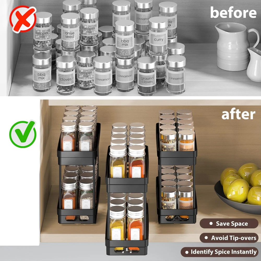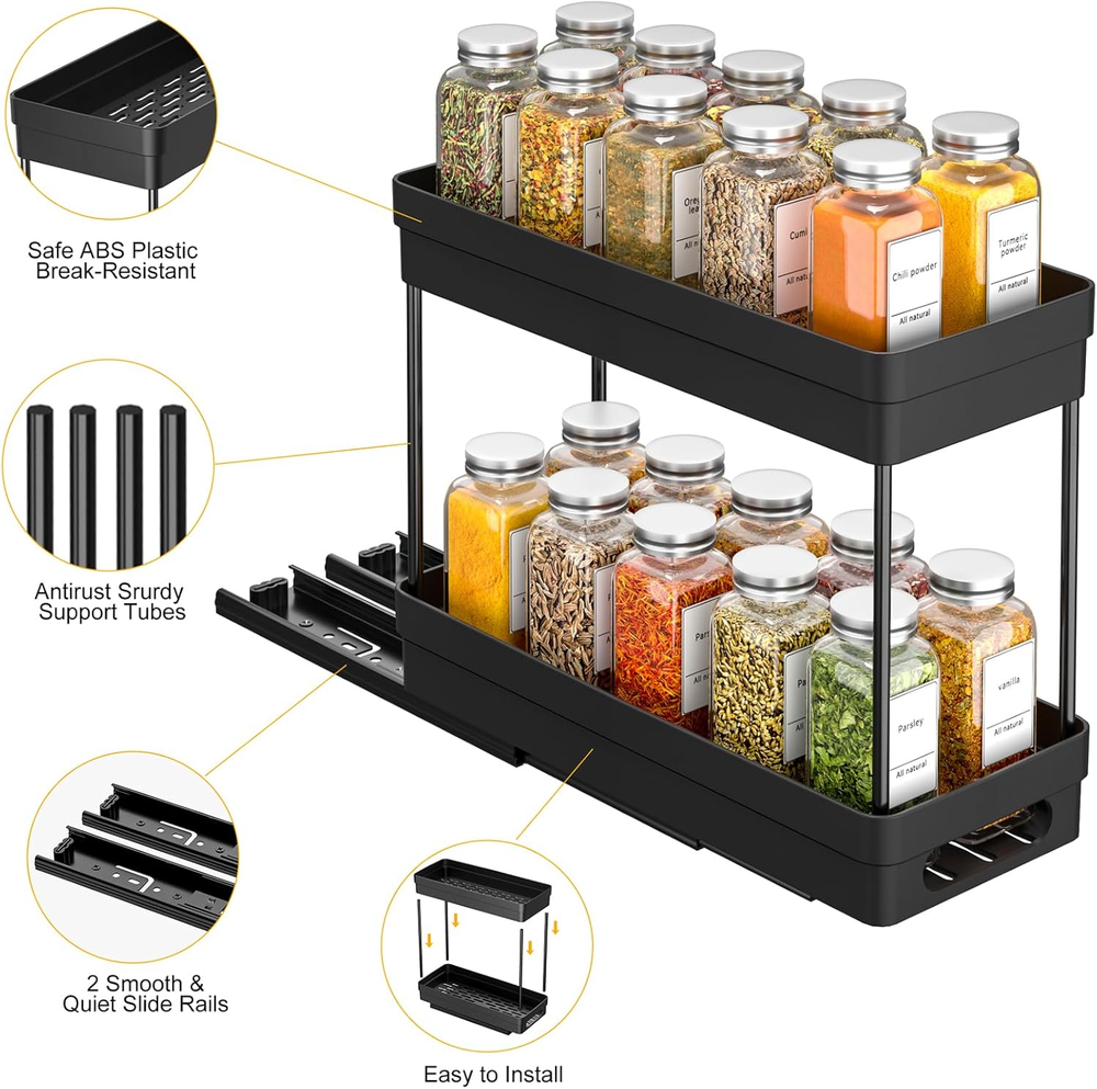 Store New Arrivals Add to Favorite View Feedback Contact Pull Out Spice Rack Organizer for Cabinet, 2-Tier Slide Out Spice Racks Organizer,Easy Installation Cabinet Organizer Seasoning Kitchen Organizer,4.4''Wx10.5''Dx8.26''H,2Pack Description Item model number 909-2 Style Modern Batteries Included? No Unit Count 2.0 Room Type Kitchen Is Customizable No Assembly Required No Product Dimensions 10.5"D x 4.4"W x 8"H Material Plastic Finish Type Powder Coated Included Components 2* Lower Baskets, 2* Top Baskets, 8* Support Tubes, 8* Screws, 4* Nano Double Sided Adhesive Strip Item Package Quantity 1 Indoor/Outdoor Usage Indoor Batteries Required? No Item Weight 3.56 pounds Finish Powder Coated Number of Shelves 2 Special Features Pull out, Slide out,Rust Resistant Special Feature Pull out, Slide out,Rust Resistant Part Number 909-2 Mounting Type RM Shelf Type Sliding Shelf Color Black Recommended Uses For Product Food Brand XIANKE Size 10.5"D x 4.4"W x 8"H [Perfect Size for Most Cabinets]: Our spice rack measures 10.5'' D x 4.4'' W x 8'' H(2pcs), making it an ideal fit for cabinets with a minimum height of 12 inches. It’s compact yet spacious enough to hold a variety of spice jars, ensuring your kitchen stays neat and organized while maximizing your cabinet space(Don't fit framed cabinets). [Smooth and Easy Sliding Action]: This pull out cabinet organizer features two smooth sliding tracks at the base of each shelf, allowing you to pull out and access your spice bottles effortlessly. The pull-out design makes it easy to find and grab exactly what you need, while the tracks ensure the shelves slide in and out without any hassle or resistance. [Two Installation Options]:The seasoning organizer offers two installation methods to suit your preferences: you can either use included nano adhesive strips for easy, no-drill mounting or secure it with screws for a more permanent setup. Both options ensure a strong, stable hold, so your spice rack stays in place while providing convenience and flexibility. [Durable and High-Quality Materials]: Crafted from premium ABS plastic and connected using rust-resistant metal tubes, this pantry organizer spice rack is built to last. The sturdy construction ensures long-term durability and reliable performance, even with daily use. The combination of plastic and metal also adds a modern and sleek touch to your kitchen decor. [Two-Tier Storage for More Bottles and Jars]: 2Pack cabinet organizer rack features a convenient two-tier design, offering extra space for spice bottles and other jars and containers, such as medicine bottles, cosmetics, or snack jars. Keep your cabinets neat and organized while maximizing storage capacity for various items in your kitchen or bathroom. Product description Specifications: Size: 10.5"D x 4.4"W x 8.27"H Pices: 2Pack Material: ABS Plastic & Metal Note: Donot fit for Cabinets with lip! XIANKE 2Pack 2-Tier Slide Out Spice Racks Organizer Dual-Layer Storage for More Spice Bottles This spice rack features a two-tier design, providing extra storage space to accommodate more spice bottles and condiments. With the added layers, you can organize your spices more efficiently, keeping your kitchen cabinets neat and orderly. Maximize your storage capacity while ensuring easy access to all your seasonings. 2 Installation Methods Easy Installation Options: use included nano adhesive strips for easy, no-drill mounting or screws for a more permanent setup, both ensuring a stable hold. Multi-purpose To Use Utilizes it in any place of the house, including the bathroom, under the sink, kitchen cabinet, pantry, craft room, shelves, and more. Pull-out Design Making take out your item easier,helps you make full use of spaces. Durable and High-Quality Materials- keeping your kitchen cabinets neat and orderly! How to install-Easily assemble in minutes! ABOUT US We offer the best prices around on high quality products. Our E-store includes media such as books, movies, music and games while offering electronics, toys, sporting apparel, clothing, tools, general home, garden items and more. SHIPPING We are always working hard to ensure your package arrives as soon as possible. Please understand that some factors like weather, high postal traffic, and the performance of shipping companies are outside of our control. We offer free shipping to the lower 48 states and ship within 2 business days of payment, usually sooner. We do not accept P.O. Boxes. Please provide a physical address. RETURNS We offer a 30-Day Return Policy on items which you are not completely satisfied with. You have the option for a full-refund or an exchange of the item. No returns are available on items shipped outside of the USA. PAYMENT We accept PayPal. CONTACT US This page content is yet to come Please ad us to your favorite seller and visit again later Thank You CUSTOMER SATISFACTION We try our very best to make sure every customer is completely satisfied. If there's a problem, message us! We're happy to help.