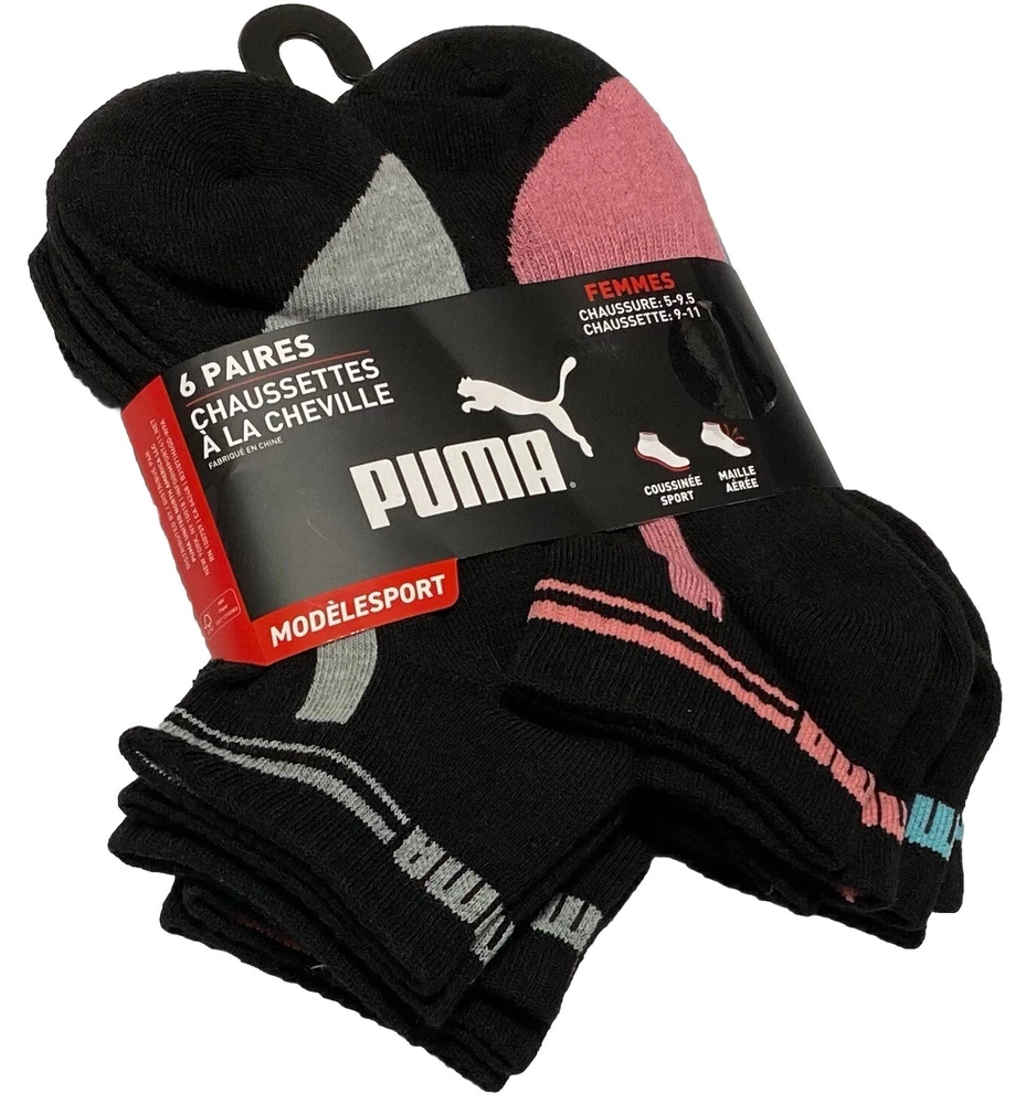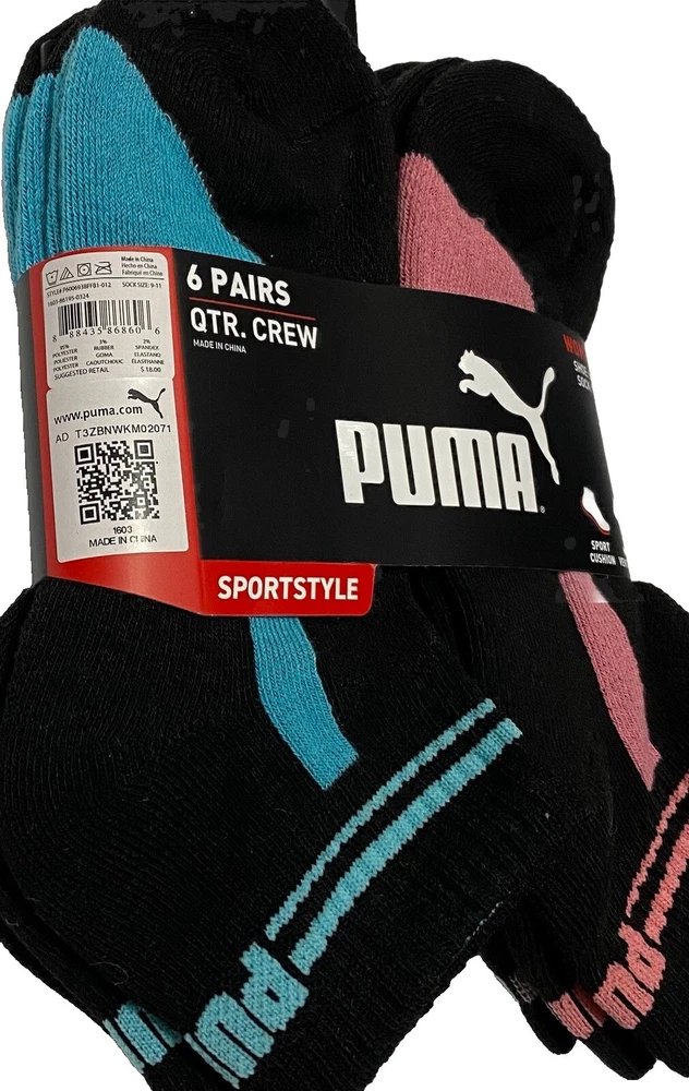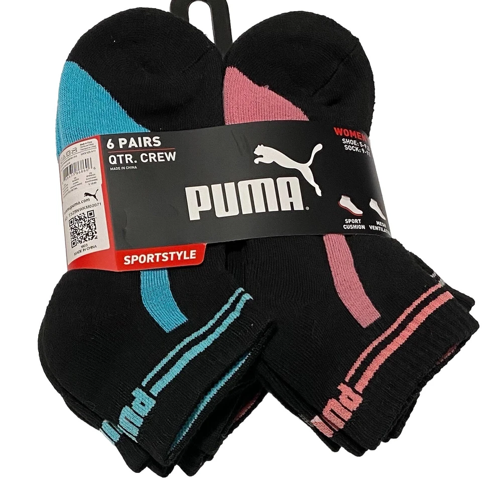 Puma SportStyle Cushioned Women's 6-Pairs Quarter Crew Socks Sport Cushion Mesh Ventilation 96% Polyester 2% Rubber 2% Spandex Assorted Black 2-Pairs Black/Gray 2-Pairs Black/Pink 2-Pairs Black/teal Fits U.S. Shoe Size 5-9.5 New In Package