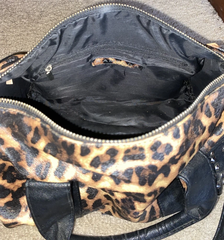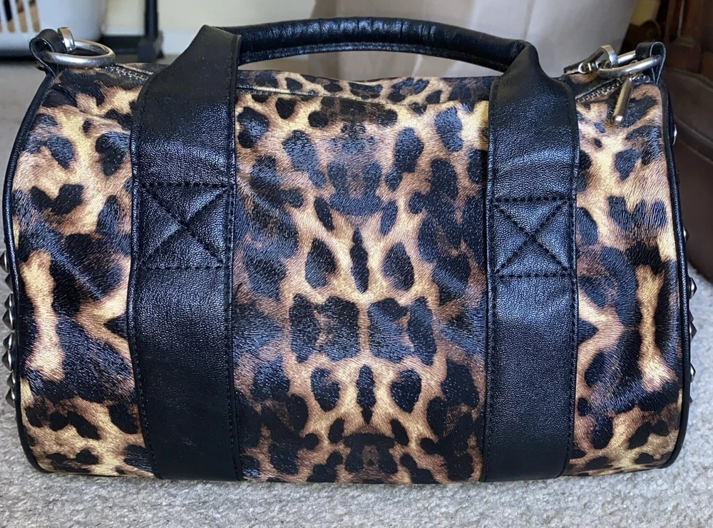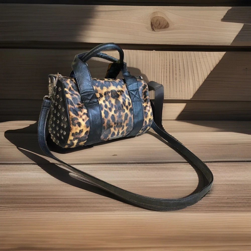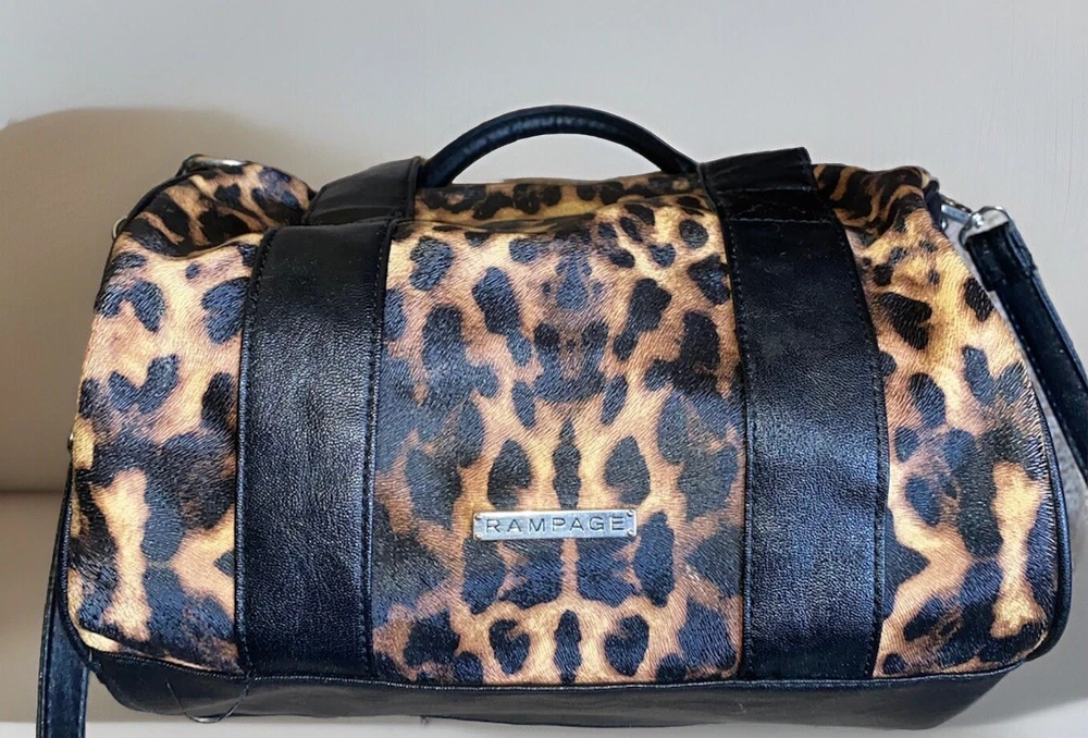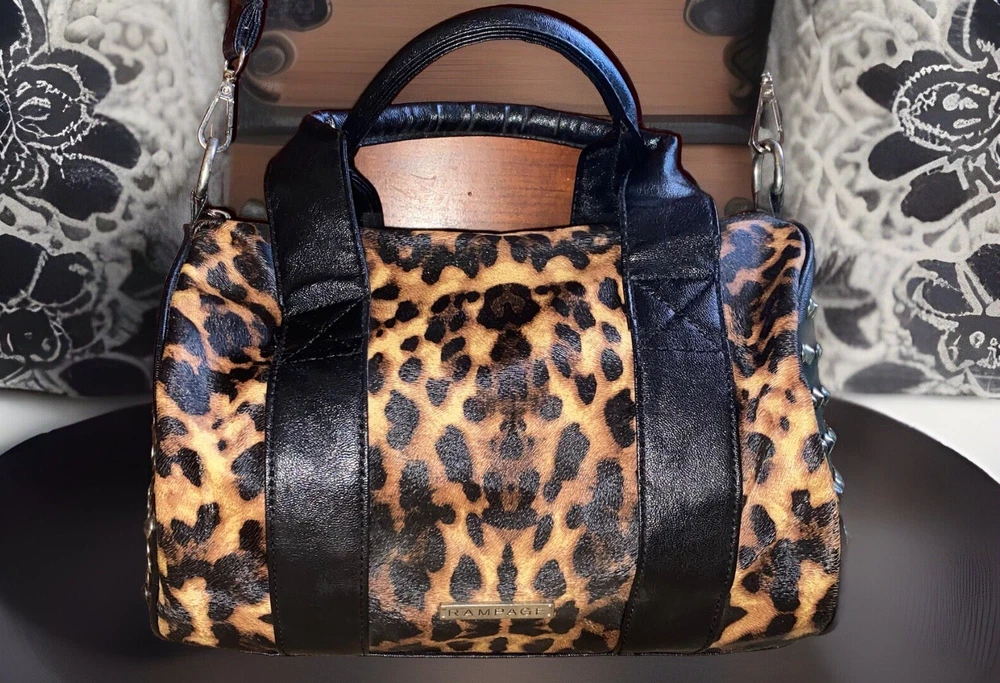 Unleash your punky glam side with this super cute leopard print studded Boston satchel bag with detachable crossbody strap by Rampage!! Details: • Condition: Very Good • Brand: Rampage • Style: Boston bag • Vibrant leopard printed exterior with black handle strap accents • Interior: Black fabric lining with zipper pocket & slip pockets • Silver tone hardware • Silver stud grommets on both ends • Black rolled double top handles • Black detachable crossbody strap with silver clips Measurements (approx): • W: 11” • D: 4” • H: 8” Make me an offer!!