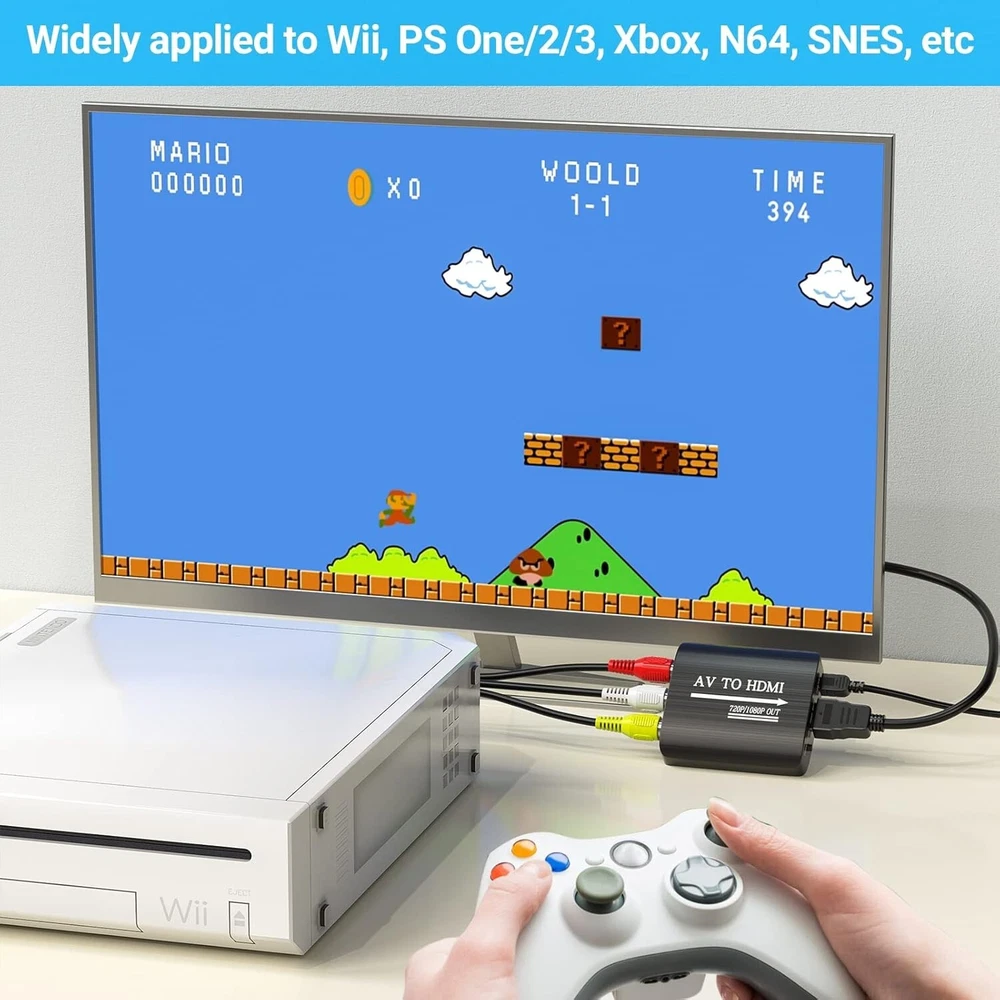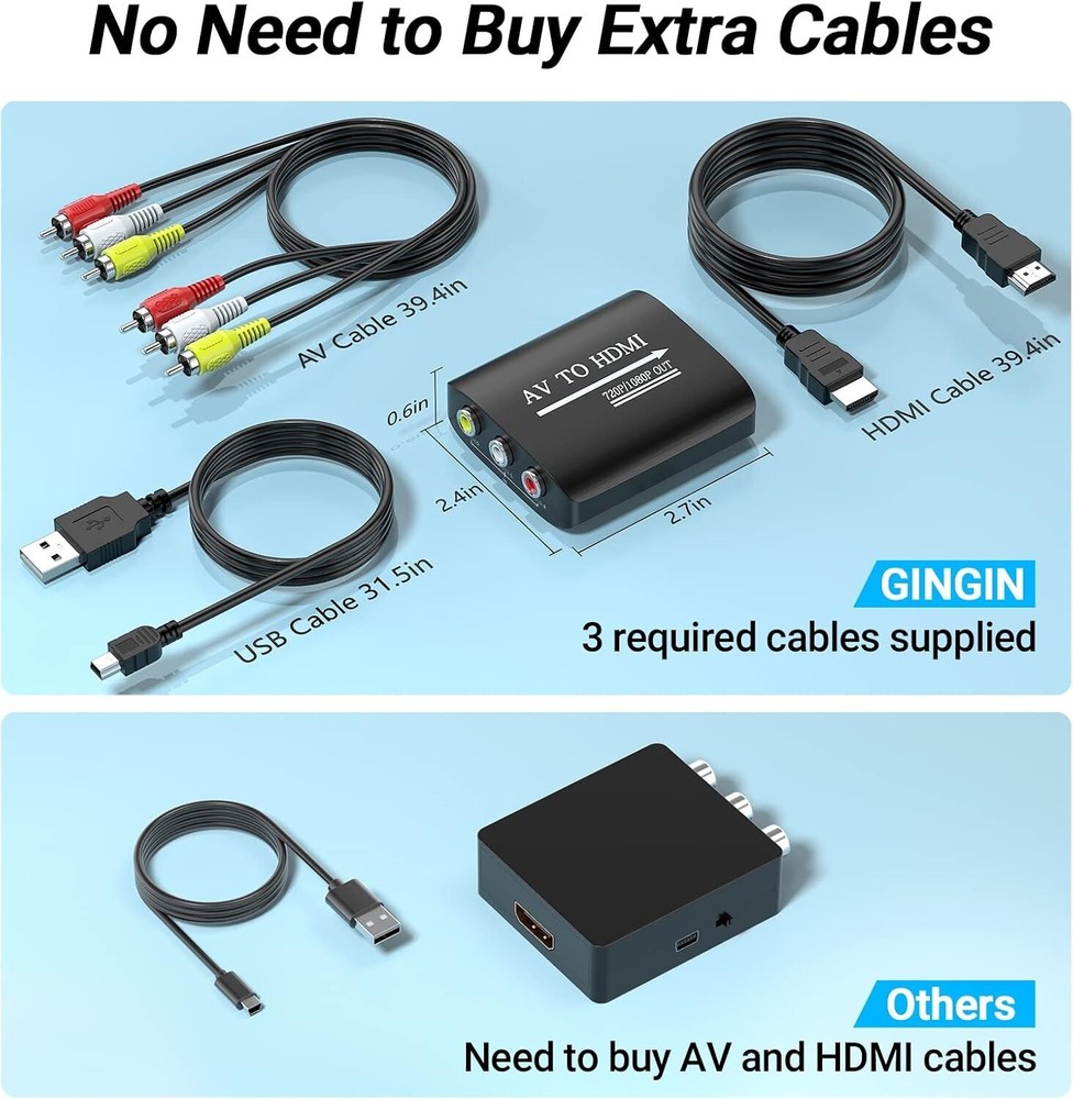 RCA to HDMI Converter 1080P AV Adapter for TV/PC/PS3/Xbox/Wii/VHS/DVD with Cable Description: RCA to HDMI Converter: Converts analog RCA composite (Yellow, White, Red) input to HDMI 720P/1080P (60HZ) output, displayed on smart TV, projector and HDTV monitor. Making video come alive, giving the most realistic HD visual experience. Important Note: RCA inputs for HDMI output only! Easy to Use : GINGIN Mini RCA to HDMI Adapter need no extra driver, portable, flexible, just plug and play. Please hook up the USB power cable (included) to 5V 1A power adapter during use. Widely Used: This AV to HDMI Adapter is widely applied to PS1, PS2, PS3, Xbox, N64, WII, STB, VHS, VCR, DVD Players and other devices with standard composite AV input. Broad Compatibility : This Audio Video to HDMI Converter supports source formats of PAL, NTSC3.58, NTSC4.43, SECAM, PAL/M, PAL/N standard TV. Provide advanced signal processing with great precision, colors, resolutions, and details. Package&After-sales Service: Package Include: 1*CVBS to HDMI Converter, 1*USB Power Cable(2.6ft/0.8m), 1*HDMI Cable(3.3ft/1m), 1*Male RCA Cables(3.3ft/1m), 1*User Manual. We provide 18 months after-sales service and 30 days no hesitate money back.