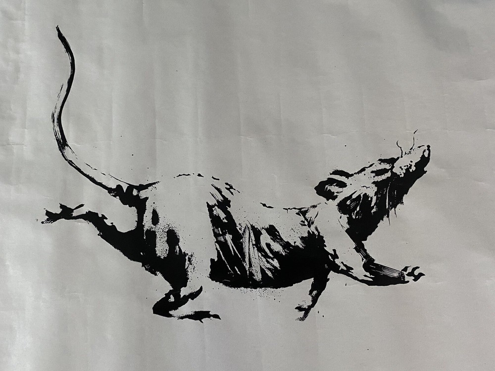 This is a rare Banksy print titled "CROYDON Gross Domestic Product RAT (RAT RACE)". It is a one-of-a-kind, limited edition screen print on paper featuring graffiti art style. The artwork falls under the themes of art and graffiti, with the subject matter revolving around famous paintings/painters and street art. This original Banksy piece is a unique addition to any art collection. ——————————— Rare Banksy gross domestic product. Amazing to have in your art collection. I was very lucky to be in the area during the art show. Has a little tear which can be hidden if put into a canvas. Other than that, still in very decent condition . Take note : *Delivery could potentially cause small damage, please notice, I am not responsible for any other other damages and will not be giving any refunds or return if product is further damaged during delivery. * collection in person is also valid.