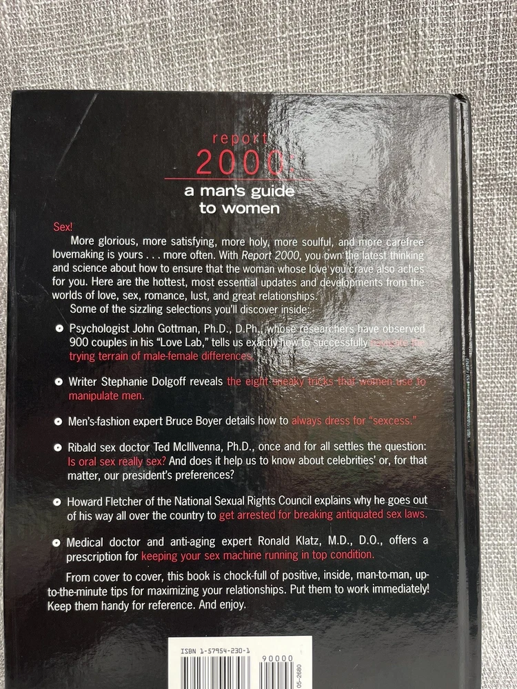 Book Title:Report 2000 A Man’s Guide To WomenNarrative Type:NonfictionTopic:WomenLanguage:EnglishPublisher:ManningPublication Year:2000Author:Larry Keller