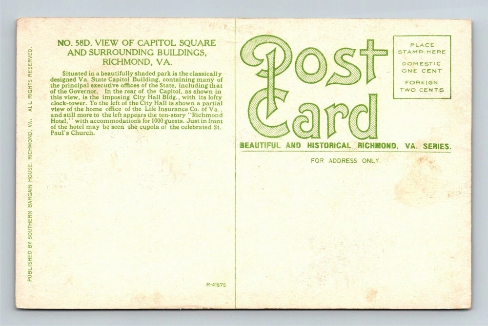 State: Virginia City/Region: Richmond Country: See Detailed Scan Circulated: Yes Type: Printed (Lithograph) City: See Detailed Scan Country/Region of Manufacture: Unknown Region: See Detailed Scan Unit of Sale: Single Unit Theme: Cities & Towns Postage Condition: Unposted Original/Licensed Reprint: Original Subject: See Detailed Scan Era: See Detailed Scan