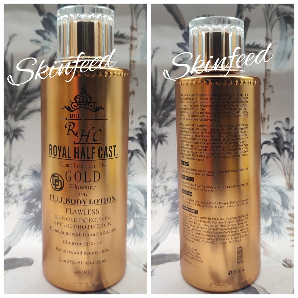 RHC Royal H-C Gold multi action whitenezer 3in1 Full body lotion spf50x1 400ml. This is a unique combination of The best lightning and skin glowing extracts to whitening your skin. Regular use will gradually fades hyperpigmentation, red skin, acne aging spots and stretch mark. this body lotion makes your skin glow in just a few days making your skin appear more radians and youthful.