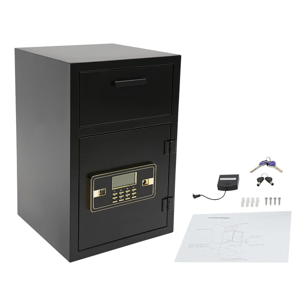 A high-quality safe can enhance your sense of security even more. This safe is made of sturdy steel and has strong reliability. The sturdy anti-theft lock can protect your valuable property, and the intelligent alarm system allows you to keep an eye on its status at all times. Having this high-quality safe allows you to confidently go out. Drop Box for Money and Mail, Drop Slot Safe, Cash Depository Safe Description A high-quality safe can enhance your sense of security even more. This safe is made of sturdy steel and has strong reliability. The sturdy anti-theft lock can protect your valuable property, and the intelligent alarm system allows you to keep an eye on its status at all times. Having this high-quality safe allows you to confidently go out. Key Features Build to Last: It is made of sturdy and thickened steel plates, and adopts laser cutting and galvanizing processes , with the advantages of high strength, wear resistance , and compression resistance , providing you with long-lasting and reliable protection. Thoughtful Design: The drop slot safe has spikes at the end and they're pretty sharp, definitely prevents nosy hands from trying to pull anything out. Large Capacity: The large size of 13.86*13.86*21.65 inches provides you with 1.31ft³ of space to help you organize important items and reduce clutter. The wide top can also be used for temporary storage of small items. Powerful Protection: The sturdy lock, thickened material, two types of unlocking keys, and high-quality lock tongues provide your valuables with anti-theft protection. Intelligent Alarm System: If the password is entered incorrectly three times, an alarm will sound and it will automatically lock for 3 minutes, while pressing the wrong key four times will lock for 10 minutes. After entering an incorrect password or being hit by a heavy object, a 60-second alarm sound will sound. An alarm will also sound when the battery is low. The intelligent alarm system enhances its security. Convenient to Use: The delivery port with a maximum opening angle of 90 ° allows you to deliver important items into the safe without opening the door, making it more convenient to use. Easy Installation: Thanks to its pre-drilled mounting holes and screws, you can mount this product on the wall or you can directly place it on the floor for more flexibility and convenience. Nice Appearance: The classic black and smooth lines give the product a sense of modernity and fashion, which can blend with most home and office decoration styles. Customer Service: Communication is the best way to solve problems. If you have any problems, please feel free to contact us. We will reply and solve the problem for you as soon as possible. Details Round Corners: The smooth corners can better ensure safety during installation and use. Practical Handle: The handle design on the delivery port makes it easy for you to open and drop items. Application It is an ideal choice for families, offices, hotels, schools, hospitals, shopping malls, banks, and restaurants to store valuable assets and belongings, such as money, check payments, files, documents, birth certificates, social security cards, coins, etc. Specification Color: Black Style: Modern Material: Steel Process: Laser Cutting, Galvanizing Shape: Rectangular Assembly Required: No Mounting Type: Wall Mount, Floor Mount Capacity: 0.037m³/1.31ft³ Steel Board Thickness: 1mm/0.04in Battery Type: 4*AA Batteries(Not Included) Product Size: 35.2*35.2*55cm/ 13.86*13.86*21.65in Package Size: 42.2*42.2*62cm/16.61*16.61*24.41in Gross Weight: 10.2kg/22.49lbs Net Weight: 9kg/19.84lbs Package Included 1* Safe 4* Keys 1* Spare Battery Box 1* English Manual All Accessories for Assembly Notes Please read the manual carefully before using it and pay attention to the dimensions of this safe before purchasing. It is advisable to set the combination when the safe door is open. After setting the code, you should enter the new code several times. The door can be locked after confirmation. You can change the password to their specific password after purchasing a new safe. Please refer to the manual for the change method. Please keep the spare key and spare battery box in a safe place. Please check that all keys are complete. Please do not leave large amounts of cash and valuables unattended. When moving and relocating, please do not hit the safe to avoid damage. When not in use for a long time, please remove the battery from the battery box. Please bring your own 4*AA batteries. Please allow the slight color difference caused by the shooting light and 1-3cm error due to manual measurement, and make sure you do not mind before ordering. Payment Delivery details Terms of sales About us Contact us Payment We accept ebay payment 。 Fees such as import duties, taxes are not included in the item price or shipping costs. These charges are the buyer's responsibility. Delivery details Shipping: 2-9 working days to: USA Terms of sales We maintain high standards of excellence and strive for hundred percent customer satisfaction. Feedback is very important to us. We hope that you contact us immediately before you give neutral or negative feedback, so that we can address your concerns. It is impossible to address issues if we do not know about them! About us Your satis faction is our ultimate goal. We work hard to earn your trust and future business. Our certified technicians have tested each item before shipping. The unit comes with 1 year limited warranty on all manufacturing defects. a) If you receive a defective item, you may return it or ask for a discount. Please contact us within 14 days after you receive the package. b) What you returned must be intact and in its original packaging as re? u. Customer is responsible for shipping costs of the returned item. c) We will cover the cost of shipping back t with the shipping rate indicated in the registration page. We will send you a new unit or refund the full payment you paid. Thank you