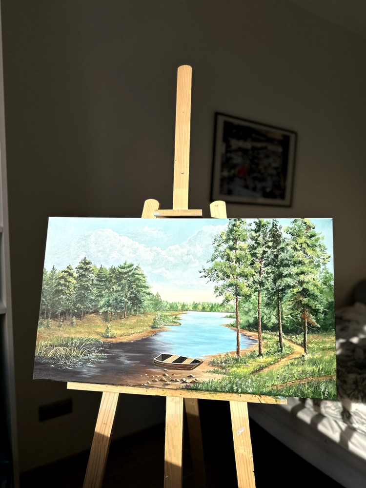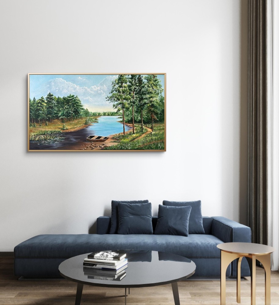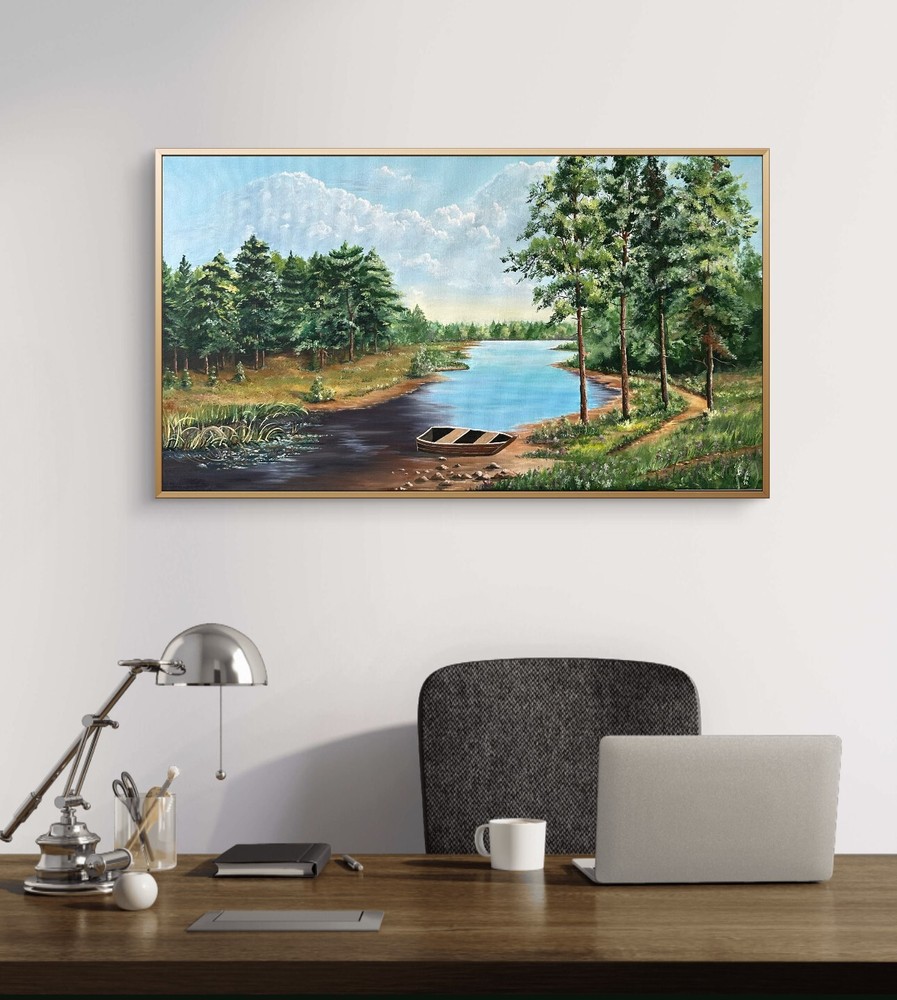 This serene landscape painting captures the peaceful beauty of a quiet riverside. A wooden boat rests on the sandy shore, surrounded by lush green trees and soft grasses, under a bright blue sky with fluffy white clouds. Perfect for adding a sense of calm and natural beauty to any space, this artwork invites viewers to pause and appreciate the tranquility of nature's embrace.
