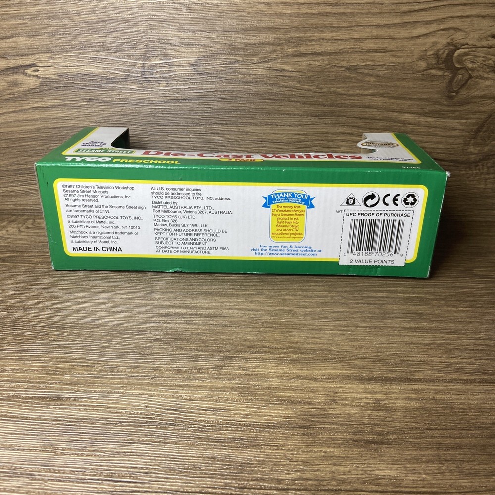 Introducing a three-pack of Sesame Street Tyco preschool matchbox die-cast vehicles from 1997. This set is brand new and still in its original packaging, never before opened. The characters include fan-favorites from Sesame Street and are perfect for children ages 3-4 years old. The set is made by Tyco, a trusted name in children's toys. This item falls under the "Toys & Hobbies" and "Preschool Toys & Pretend Play" categories, making it a great addition to any child's collection.