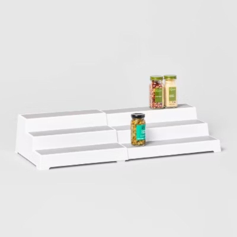 Description Organize spices and other essentials in your kitchen with the 3-Tier Expandable Shelf from Brightroom™. This stair-step shelf has three levels that provide plenty of space for bottles and jars in your cabinets. If the size can't hold everything, simply pull out the extender to increase the width and gain more storage space. The white plastic expandable shelf will look great with any color scheme or decor style, so you can even leave it on a counter for an eye-catching organizational solution. Brightroom™ started with a simple truth: When you’ve got it together, you feel better. Our versatile designs reveal the possibility in every closet, cupboard and drawer, and work together to create brilliant ways to organize your every day. highlights 3-tier expandable shelf elevates spices and everyday essentials to create extra space Nestled shelf expands horizontally for added storage Stairs-step shelf makes finding spices a breeze Can be spot cleaned for easy care Fully expanded width 23.73”