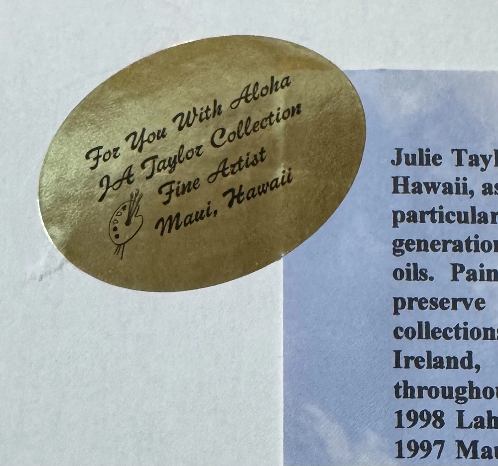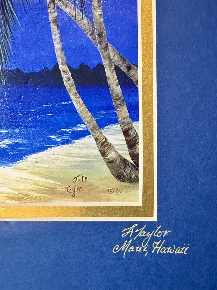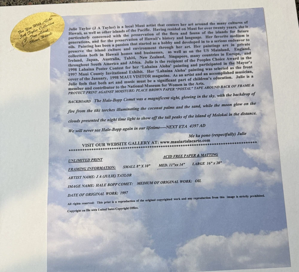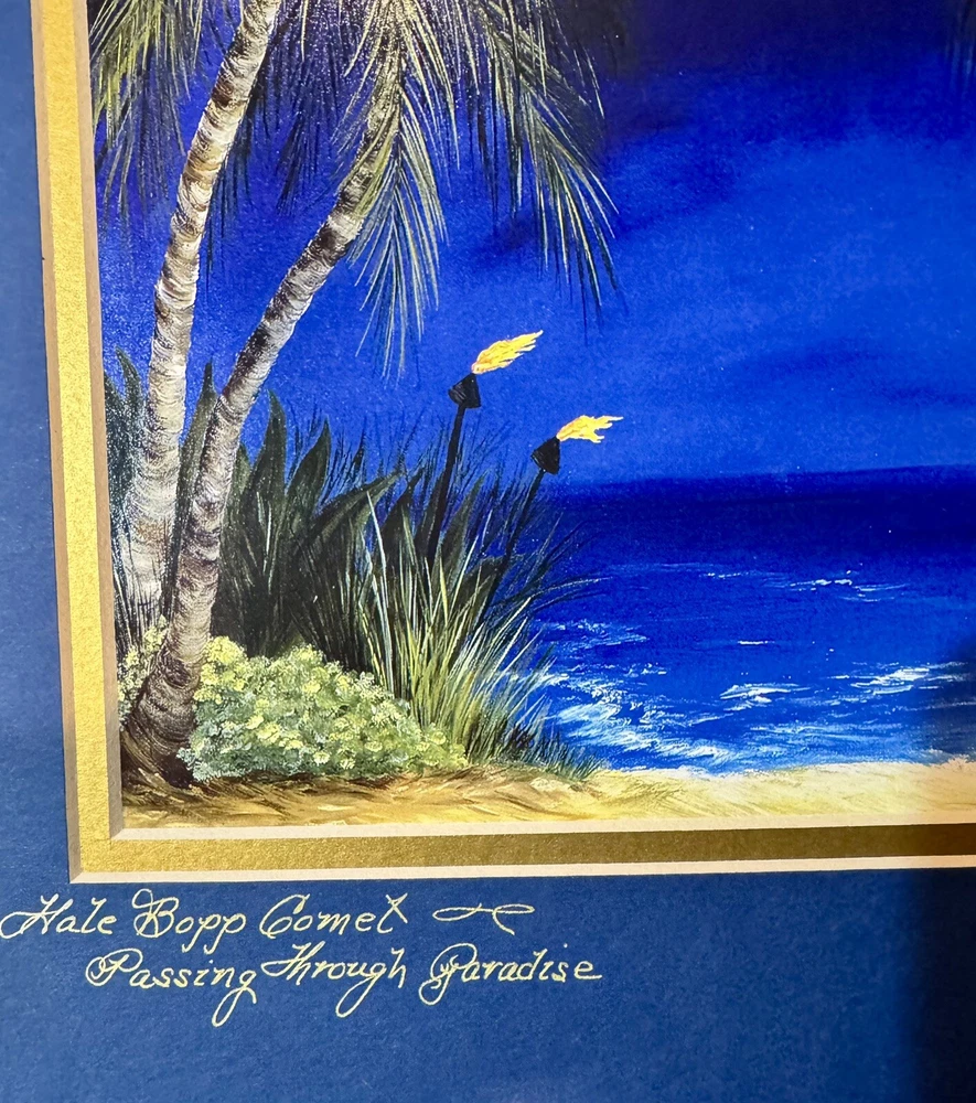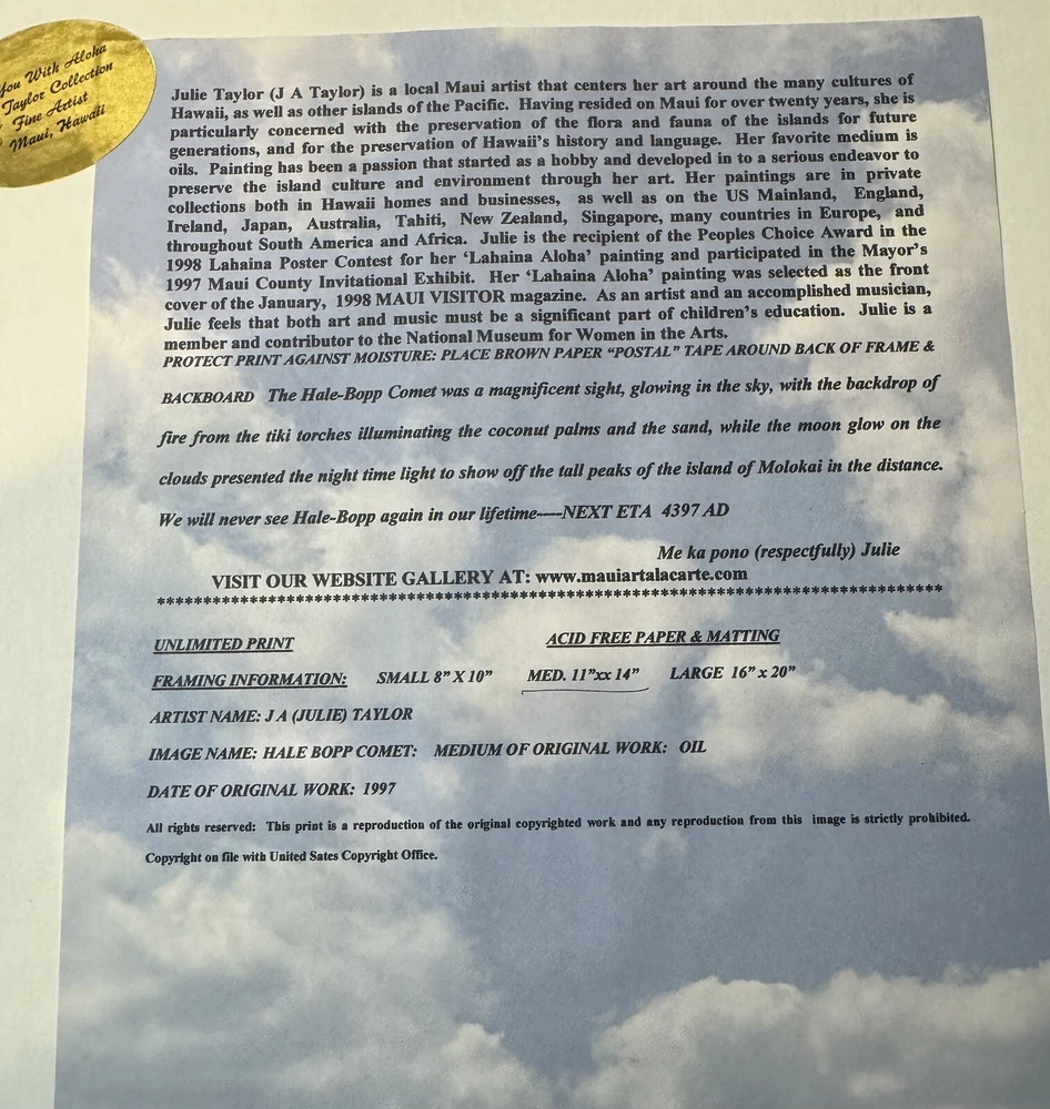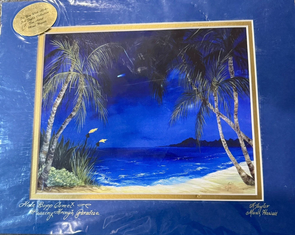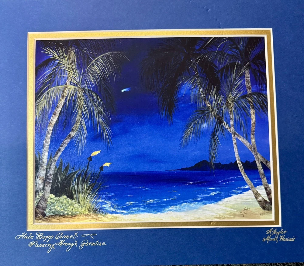 Signed By Artist Julie Taylor “Hale Bopp Comet Passing through Paradise”Maui,Hi True Hawaiiana print. Hale Bopp passing through with a beautiful beach scene. Amazingly Los Angeles, Los Angeles, we will never see Haley bop, again in our lifetime. This captures the beauty and the amazing historical moment. Sadly, most of Lahaina Maui Hawaii was damaged in 2023 fire.