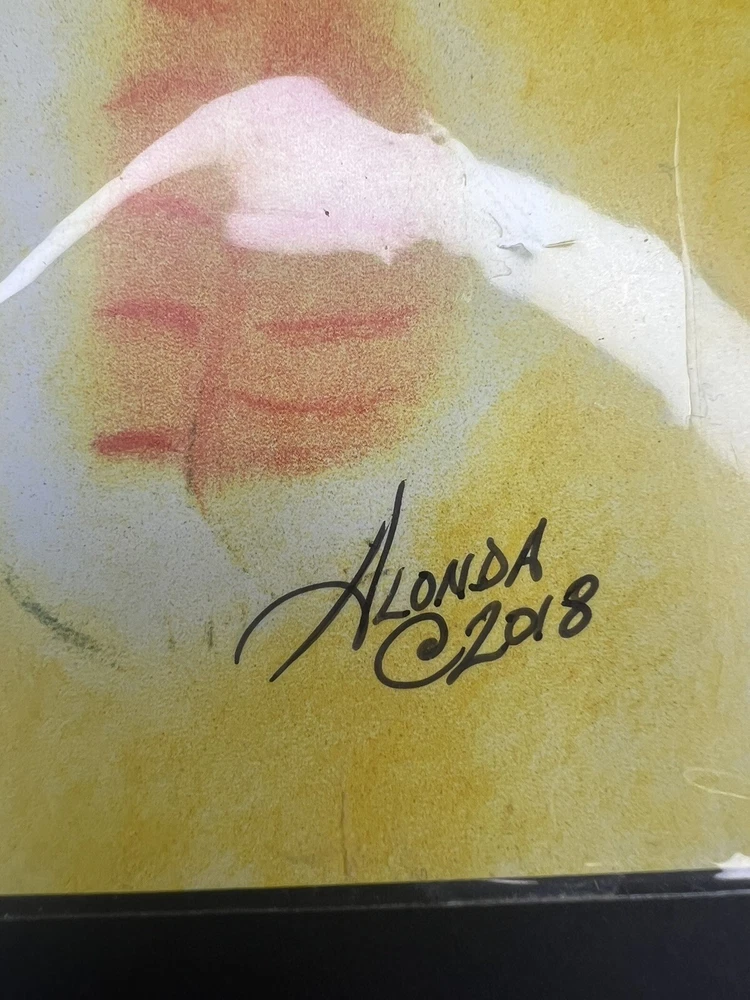 The product is a medium-sized print of a cat created by the artist Alonda in 2018. The artwork features a contemporary art style with a color palette of orange, blue, and yellow. It is a licensed reprint originating from Louisiana, USA, with a theme centered around art and animals, specifically cats. The print is signed by the artist and would make a vibrant addition to any art collection, especially for those who appreciate feline-themed artwork.