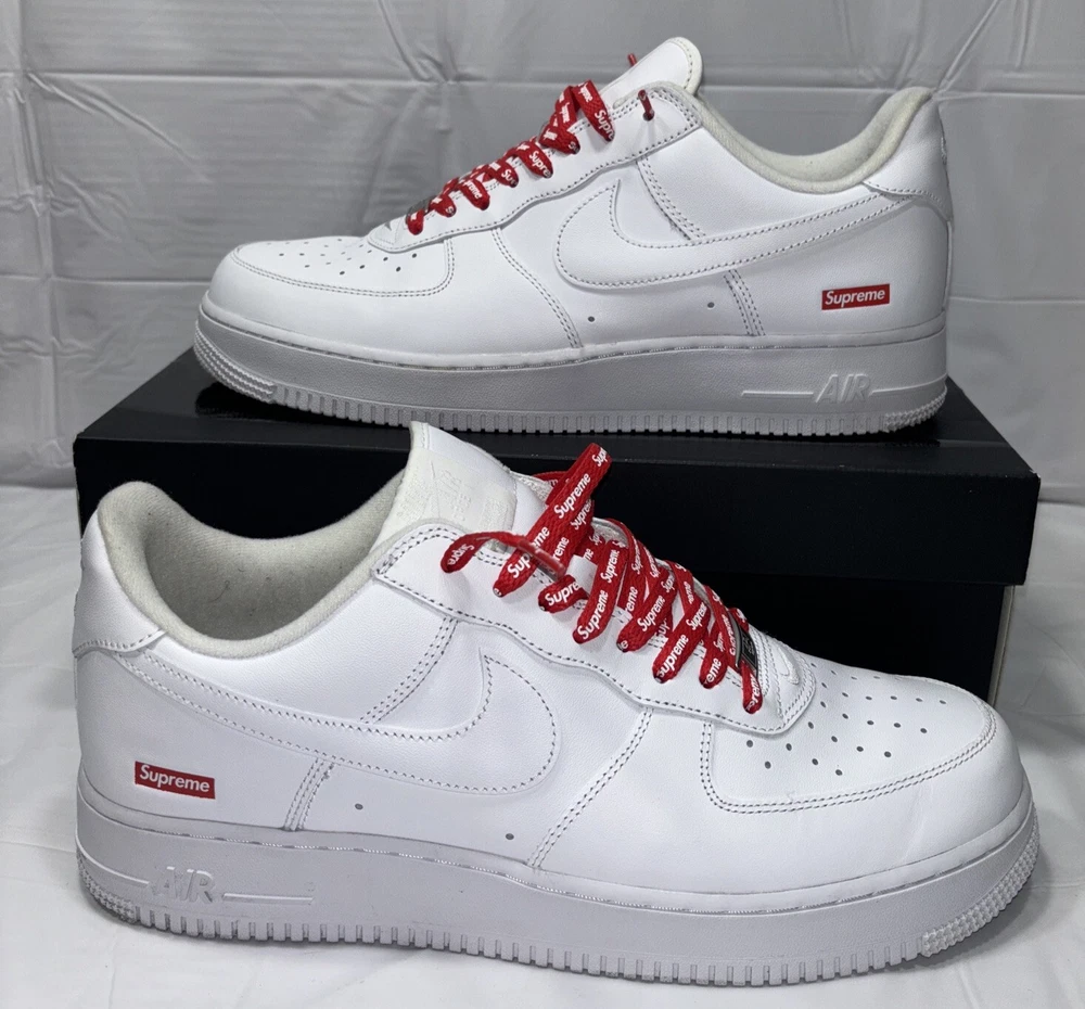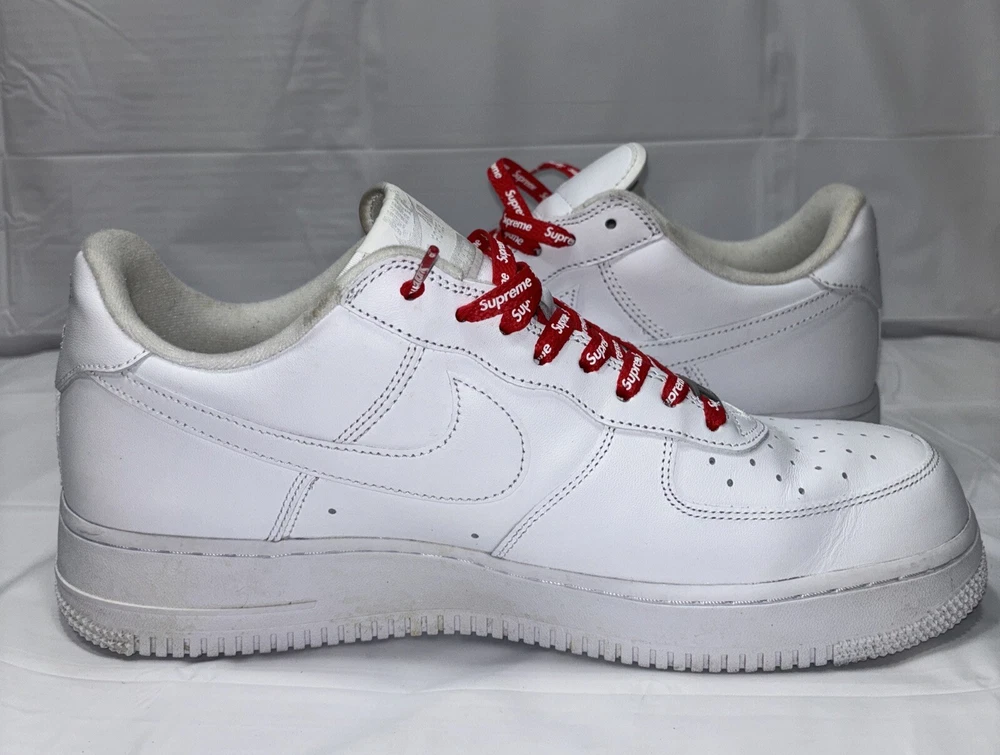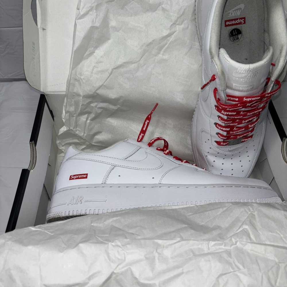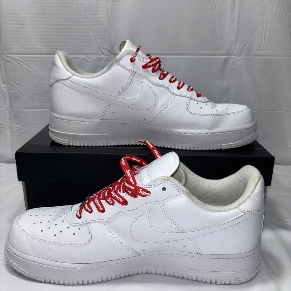 The manufacturer color is white, and the style code is CU9225-100. These shoes are part of the Nike Air Force product line, and they were released in 2020. Perfect for any athletic occasion, these sneakers are sure to turn heads. The box is the original one with the Supreme logo. They are very comfortable to use for everyday life. As used still in good condition, needs a little fresh up to bright again even more 😊 Please before purchasing feel free to reach out to us for any questions or to post more pictures.