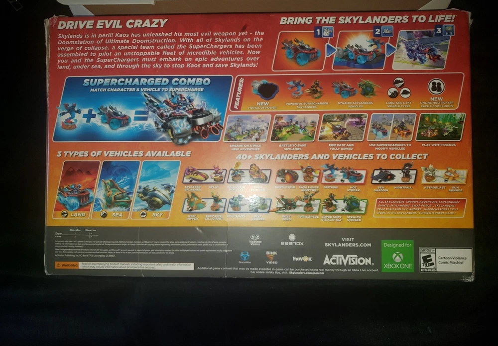 Box was opened and a little banged up but was never used...game still sealed Get ready for an epic adventure with the Skylanders SuperChargers Starter Pack for Xbox One. This pack includes everything you need to dive into the world of Skylanders and start exploring. With a manual, you'll have all the tools you need to navigate the game and customize your character. Experience the thrill of multiplayer and online playability as you journey through the game. This pack is perfect for anyone who loves platformer and role-playing genres. Published by Activision, this game is rated E10+ (Everyone 10+) and was released in 2015. Join the battle and become a SuperCharger today!