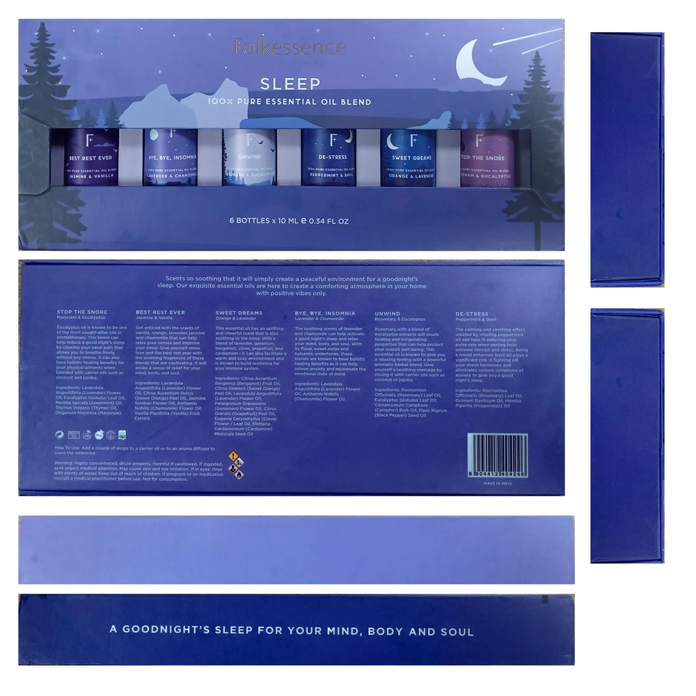 Folkulture Sleep Essential Oils Set | Pure Essential Oils for Diffusers for Home, Set of 6 Essential Oil Blend or Oil Diffuser Essential Oils - Lavender, Rosemary & Peppermint [VALUE PACK - Set of 6] - These essential oils set come in a value pack of 6 - 10ml widely used ingredients that include eucalyptus essenital oil, jasmine essential oil, lavender essential oil, peppermint oil, rosemary essential oils, orange oil. [QUALITY - Rigorous Testing] - Handcrafted from our popular home fragrance brand Folkessence, the ingredients of these essential oils for diffuser for home are rigorously tested to give you a luxurious experience. [PERFECT GIFT] - These essential oils natural or essential oil blends for humidifiers come in a beautiful packaging that is vibrant and makes for an ideal gift option for your loved ones on occasions such as housewarmings, birthdays, anniversaries. This essential oil set are a wonderful christmas gifts for woman and christmas gifts for mom. [MULTIPURPOSE] - These essential oils for sleep can also be used in candles making, lotions, these oils are versatile enough for soap base, perfumes, cleaning, art & craft projects, pine cones, incense sticks or cones, other unscented products and so much more! [BENEFITS] - These fragrance oils or diffuser oils are a handy way to indulge yourself. SHIPPING - We offer FREE shipping on all orders! - We ship within 3 business days of payment, usually sooner - We only ship to the lower 48 states, no APO/FPO addresses or PO Boxes allowed International buyers – please note: Import duties, taxes, and charges aren't included in the item price or postage cost. These charges are the buyer's responsibility. - Please check with your country's customs office to determine what these additional costs will be prior to bidding or buying. - We have confidence in our products, but if you are not fully satisfied please contact us within 30 days of purchase and you will get full refund. * Order Cancellation Policy ** You can return a product for up to 30 days from the date you purchased it. 1. The seller reserves the right to cancel the special case only due to eBay cancellation fee. 2. The decision of seller is the final. 3. The seller will respond to the cancellation request within 2 business days. Please wait for the result of cancellation. 4. In case the cancellation is not completed by some reasons, the buyer can follow the options below to get the refund. 4.1 The buyer can reject the item when it arrives. 4.2 The buyer can send the item back to the seller within 30 days If the buyer receives item (USA Shipment ONLY). The seller will provide the FREE return label to the buyer when the buyer opens " Return Item" case on eBay by using the reason as "Change my mind" ONLY. 5. When buyer has placed the order. The order will be processed and completed by automatic warehouse system within 5 minutes. In case that buyer sends the cancellation request after 5 minutes of placing the order, the request will be rejected. **Sending direct message to cancel the order is not allowed for every case.* Return Policy For the return case - If buyer would like to return the items for refund or replacement, please CONTACT SELLER to receive the free return label from seller. The refund or replacement will be processed with the tracking number of return label which is provided by seller only. The other ways of return which are not approved by seller will not be processed for the refund or replacement.