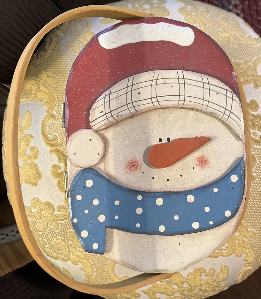 Shape:RectangleDepartment:AdultsTime Period Manufactured:2000-2009Type:Display BasketClosure Type:hinged lidBrand:UnbrandedSuitable For:Furniture, Floor, FabricsRoom:Any RoomOccasion:WinterCharacter:snowmanPattern:WovenColor:red white blue tanFeatures:With Handle, With LidSize:MediumStyle:CountryMaterial:Wood, WoodenYear Manufactured:2000Country/Region of Manufacture:UnknownTheme:Winter HolidayFinish:Painted