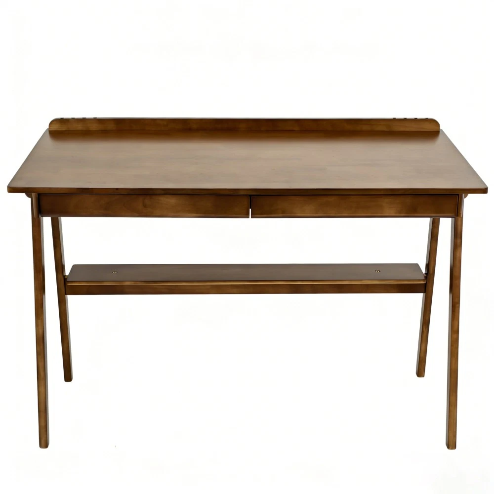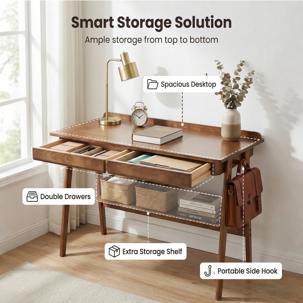 Solid Wood Writing Desk, Home Office Desk for Small Spaces, Mid Century Modern Desks with 2 Drawers & Storage Shelf, Standing Desk with Side Hooks for Study, Bedroom, Office (Walnut) Constructed from 100% premium solid wood, this desk delivers outstanding durability, strong load-bearing capacity, and resistance to warping or cracking for long-lasting use. The natural wood grain adds a touch of organic elegance, creating a warm and sophisticated atmosphere in any room. The generous 47.24” x 23.62” desktop provides ample space for your laptop, books, and daily essentials, while two large solid wood drawers keep documents, stationery, and small supplies neatly organized and out of sight. Thoughtful details include a protective edge to prevent items from slipping, built-in pen holder holes for easy access, and sturdy side hooks for hanging headphones or bags. A convenient under-desk storage shelf expands your storage options without crowding your workspace, ideal for boxes, folders, or extra books. This multi-purpose desk works as a writing desk, computer desk, study table, office desk, or even a vanity, adapting to your daily needs. Assembly is simple and straightforward with all necessary tools and clear instructions included, so you can enjoy your new desk quickly without extra hassle or expense. We are committed to your satisfaction with a 1-Year Warranty and 30-Day Free Return & Exchange Policy for a worry-free shopping experience.
