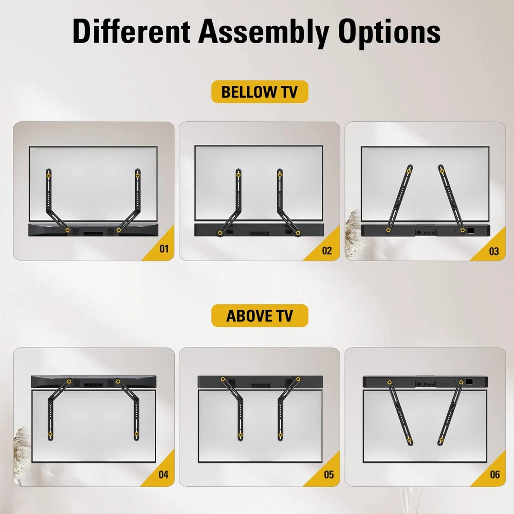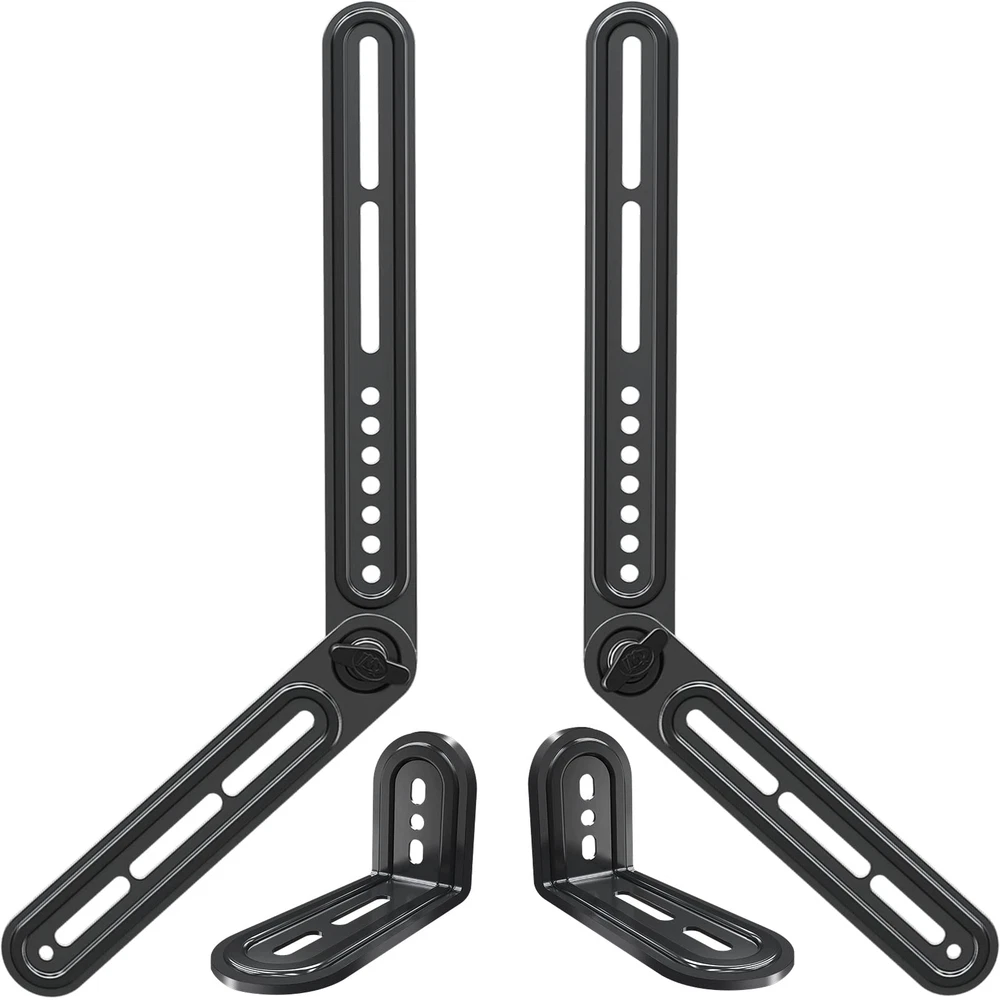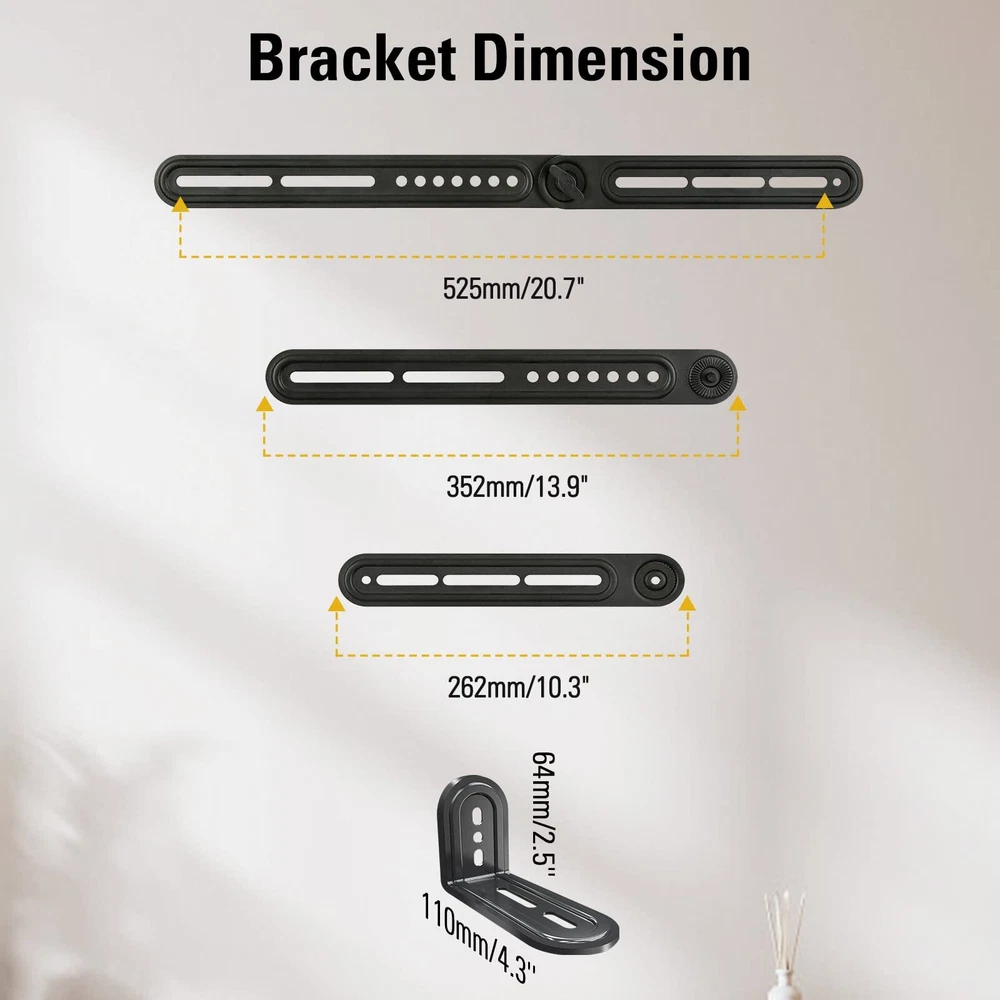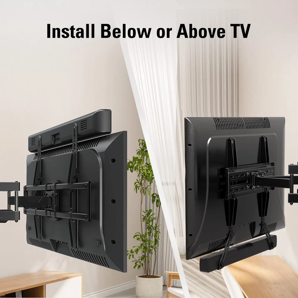 22 lbs Loading capacity The bracket adopts high quality 2 0mm steel fits sound bar up to 22 lbs/10kg Withstood 2 time loading test (44 lbs) for secure and stable use Flexibility with long and short extension plates sets extension plates are adjustable and more flexible for most of TVs with standard TV mounting holes patterns sits above or under TV secure sound bar parallel above or under TV provide clean look with wires running behind TV back Save space without need of shelf and avoid leaving screw holes in wall with mount for better auditory will be enhanced if apply sound bar with wall mounts (fixed tilt full-motion mount) full-motion mount works especially well with sound bar bracket for sound bar installed with sound bar bracket follows mounted TV to move toward same direction for best auditory and view These full motion mounts are with sound bar brackets hardware for TV and sound bar installation easy Installation with all necessary hardware included for TV and sound bar Universal Design - Our soundbar mounting bracket can hold a soundbar up to 15LBS/6.8KG. It fits most of SAMSUNG, SONY, VIZIO, BOSE, YAMAHA Sound Bars. with wall mounts (fixed, tilt, full-motion mount), TV VESA up to 600x400mm. (For Sonos Beam, please refer to soundbar mount MD5426) Multi-Style Assembly - The detachable long extension plates are adjustable, allowing 180 degrees swivel for more mounting flexibility than fixed brackets sold on the market. Easy Installation - Easily secures the soundbar above or below the TV. The teeth on the arms connection lock the soundbar firmly in place, avoiding leaving screw holes in the wall and making the installation a breeze. Necessary Hardware Included - Come with decent instruction and necessary hardware. We provide the L-shaped bracket for soundbar with mounting holes in the bottom. Purchase Support - Our US-based customer support will answer your pre-purchase and installation questions every day. Our TV mount is 10-year warranted!