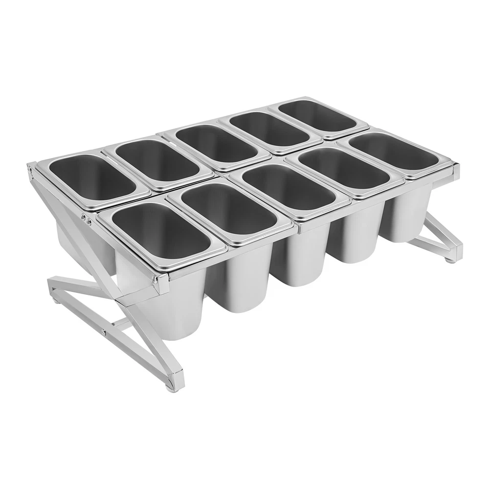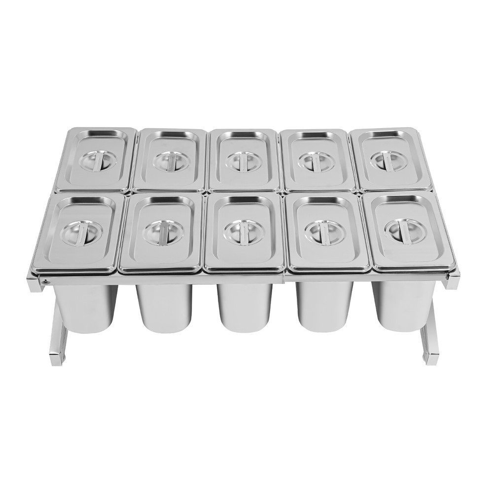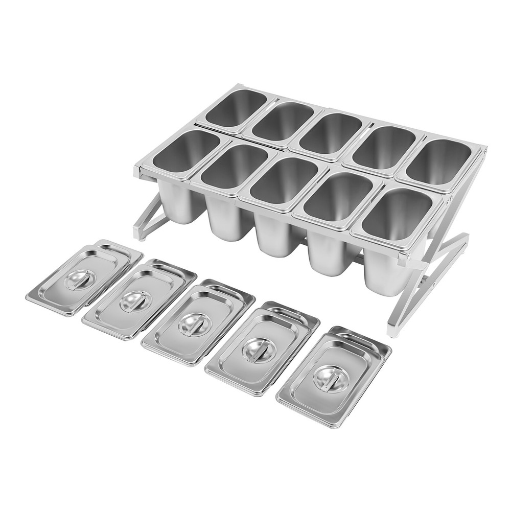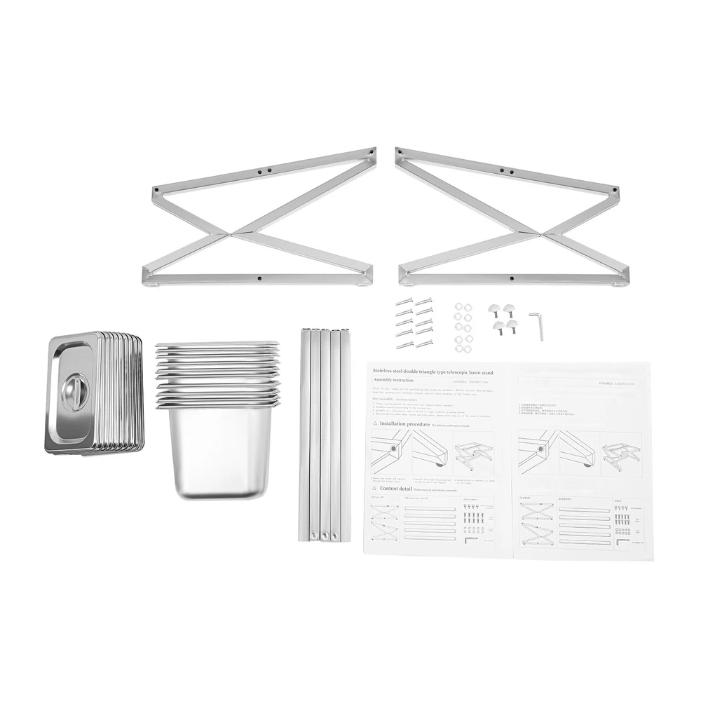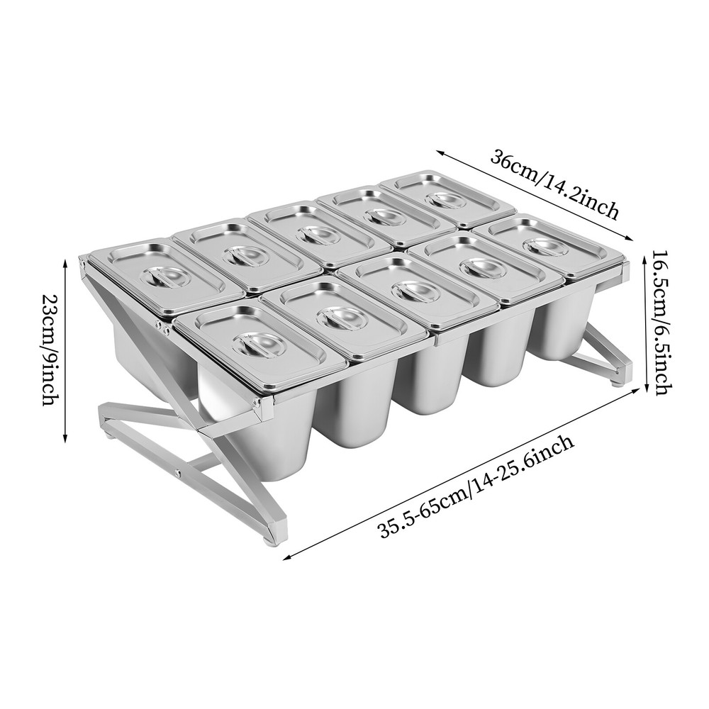 Specification Material: 201 Stainless Steel Process: Electrolytic Color: Silver Mount Type: Countertop Assembly Required: Yes Dishwasher Safe: Yes Shape: Rectangle, Triangle Pan Type: 1/9 Number of Pans: 10 Total Load Capacity: 100kg/220.46lbs Each Pan Size: 11*17.5*15cm/4.33*6.88*5.9in Each Lid Size: 11*17.5cm/4.33*6.88in Adjustable Product Length: 35.5-65cm/14-25.6in Product Size(W*H): 36*23cm/14.2*9in Package Size: 40*30*20cm/15.74*11.81*7.87in Gross Weight: 4.5kg/9.92lbs Net Weight: 4.27kg/9.41lbs Package Included 1* Spice Rack 10* Pans 10* Lids 1* Chinese&English Installation Diagram Other Accessories for Assembly Spice Rack, Inclined Expandable Spice Rack Set, Countertop Condiment Holder Description Are you still troubled with not having a satisfactory assistant in the kitchen or restaurants? Let's take a look at this spice rack ! Whether in a home kitchen or a commercial food service area, this product offers a reliable solution for efficient food storage and display, combining functionality, durability, and convenience. It will save you a lot of trouble and be your good partner. Don't wait, bring it home! Key Features Build to Last: Made of premium 201 stainless steel with an electrolytic process , this product is wear-resistant, corrosion-resistant, and rustproof, ensuring its durability and reliability for long-term use. Large Capacity: Each pan's size is 4.33*6.88*5.9 inches and there are a total of 10 pans, providing ample space to hold a substantial amount of spice and making it a highly practical choice for both commercial and domestic food storage and display purposes. Expandable Length: With an adjustable length that ranges from 14 inches to 25.6 inches, this product offers great flexibility and allows you to customize the size according to different spatial requirements and usage scenarios, enhancing its adaptability and practicality in various environments. Stable Structure: The triangular and inclined design, combined with a well-engineered support system, distributes the weight evenly across the base, preventing it from tipping over even when fully loaded with a weight of 220.46 lbs and ensuring exceptional stability. The inclined design provides a clearer sight and allows you to access items easily. Dustproof and Independent Placement: The high-class lids and independent food pan design allow you to place different spices separately, effectively preventing dust and debris from contaminating the food, avoiding cross-contamination, and preserving the original flavor of the spices. Easy to Clean: The product has a smooth and flat surface, and a simple structure and detachable pans, making it easy to clean, and it can be cleaned with a dishwasher machine, which is time-saving and effort-saving. Effortless Installation: Its simple structure and complete accessories ensure a smooth installation process, which is convenient and user-friendly. Buy with Confidence: We stand behind all our guests and look forward to assisting you with your purchase. It is our pleasure to answer your confusion and questions. Details Practical Lid: The lid with a handle can prevent dust and insects from entering, keep the food fresh, and make it easy for you to close and open the lid. Foot Pads: They enhance the stability of the product, preventing it from wobbling or sliding on various surfaces, even when fully loaded. Stackable Pan: It enables convenient storage when the pans are not in use, saving a significant amount of space in your kitchen or storage area. Smooth Edge: It prevents accidental cuts and scratches during handling, ensuring safety and a comfortable user experience. Application It is suitable for restaurants, buffets, cafes, food trucks, milk tea shops, home kitchens, etc. It can be used to hold spices, condiments, snacks, sauces, small side dishes, vegetables, fruits, etc. Specification Material: 201 Stainless Steel Process: Electrolytic Color: Silver Mount Type: Countertop Assembly Required: Yes Dishwasher Safe: Yes Shape: Rectangle, Triangle Pan Type: 1/9 Number of Pans: 10 Total Load Capacity: 100kg/220.46lbs Each Pan Size: 11*17.5*15cm/4.33*6.88*5.9in Each Lid Size: 11*17.5cm/4.33*6.88in Adjustable Product Length: 35.5-65cm/14-25.6in Product Size(W*H): 36*23cm/14.2*9in Package Size: 40*30*20cm/15.74*11.81*7.87in Gross Weight: 4.5kg/9.92lbs Net Weight: 4.27kg/9.41lbs Package Included 1* Spice Rack 10* Pans 10* Lids 1* Chinese&English Installation Diagram Other Accessories for Assembly Notes Please check the product size carefully before purchasing. Please note that this product does not include other items shown in the picture. Please allow the slight color difference caused by the shooting light and the 1-3 cm error due to manual measurement, and make sure you do not mind before ordering. Payment Delivery details Terms of sales About us Contact us Payment We accept ebay payment 。 Fees such as import duties, taxes are not included in the item price or shipping costs. These charges are the buyer's responsibility. Delivery details Shipping: 2-9 working days to: USA Terms of sales We maintain high standards of excellence and strive for hundred percent customer satisfaction. Feedback is very important to us. We hope that you contact us immediately before you give neutral or negative feedback, so that we can address your concerns. It is impossible to address issues if we do not know about them! About us Your satis faction is our ultimate goal. We work hard to earn your trust and future business. Our certified technicians have tested each item before shipping. The unit comes with 1 year limited warranty on all manufacturing defects. a) If you receive a defective item, you may return it or ask for a discount. Please contact us within 14 days after you receive the package. b) What you returned must be intact and in its original packaging as re? u. Customer is responsible for shipping costs of the returned item. c) We will cover the cost of shipping back t with the shipping rate in