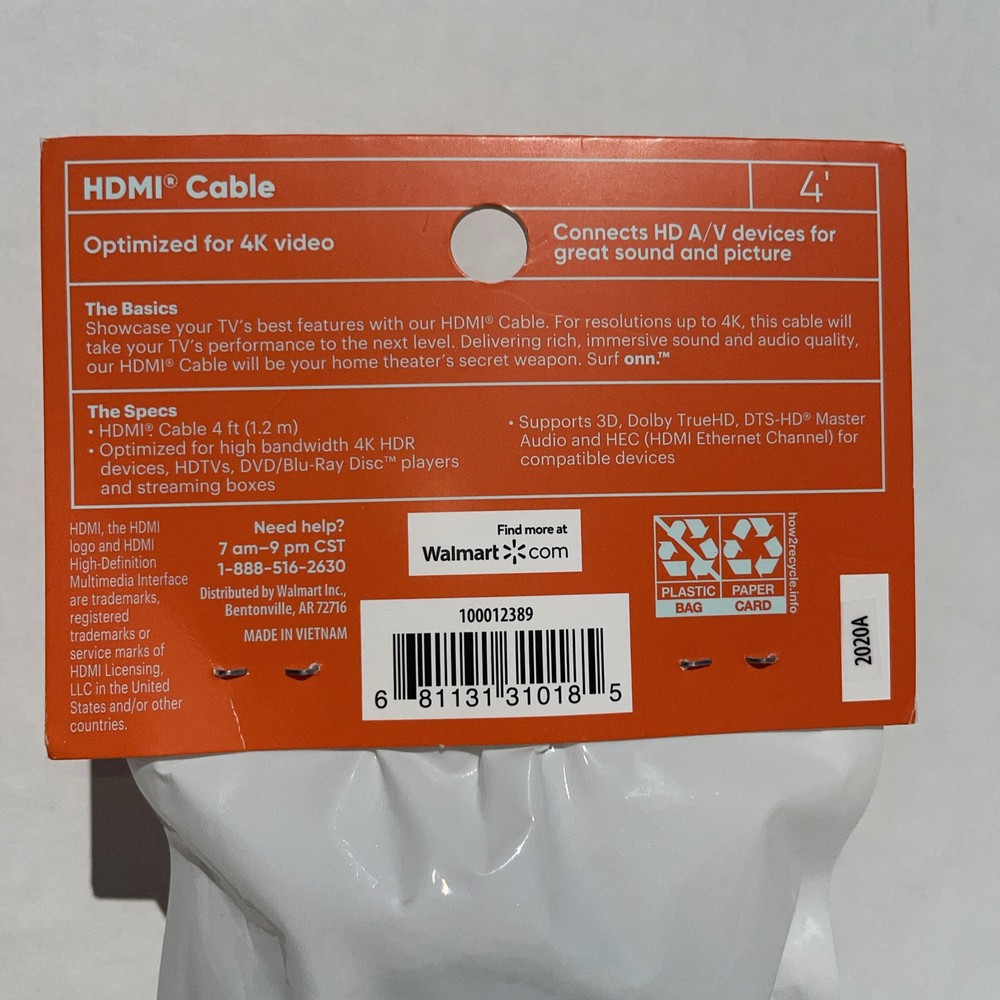 The Onn 2.0 HDMI Cable is a 4ft black cable optimized for 4K video. It features a two-way splitter, is powered, and has a 12 AWG gauge. The cable has HDMI connectors and an output voltage of 5V. It is compatible with universal brands and models, and the manufacturer offers a 6-month warranty. This HDMI cable is designed for high-quality audio and video transmission.