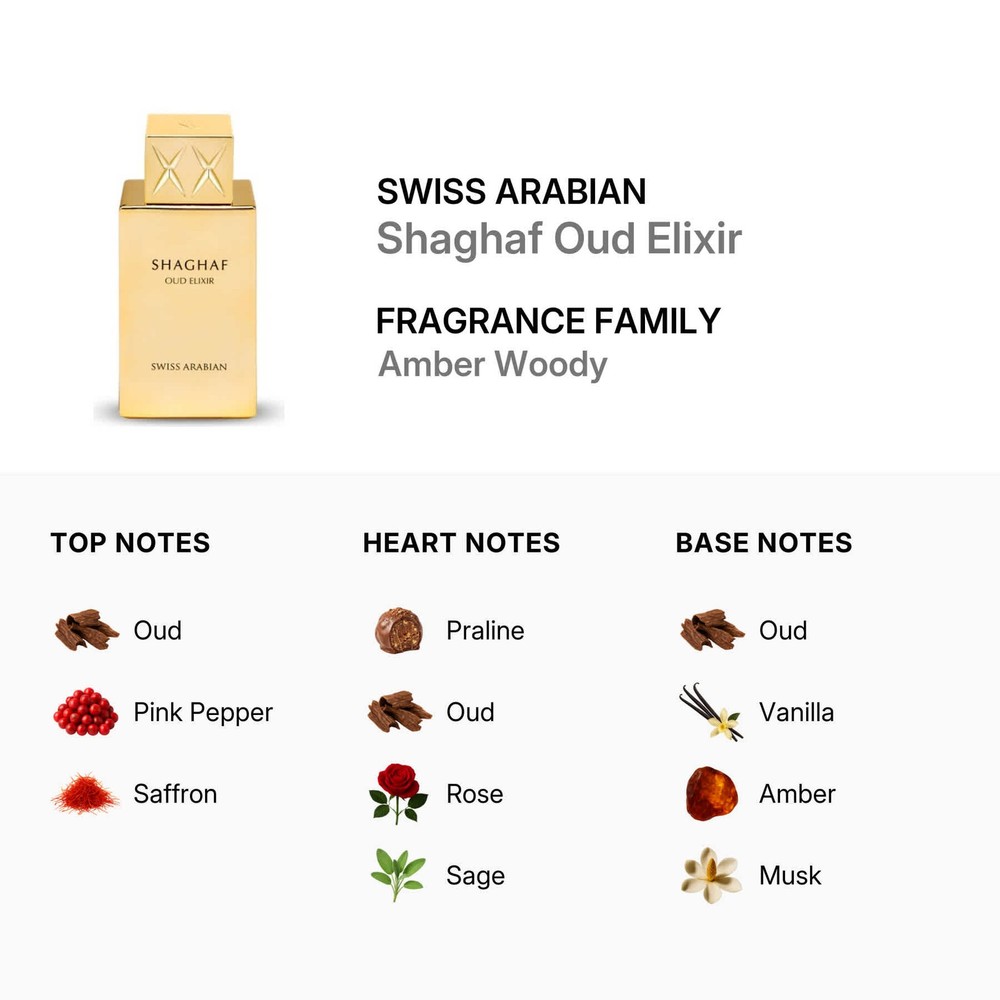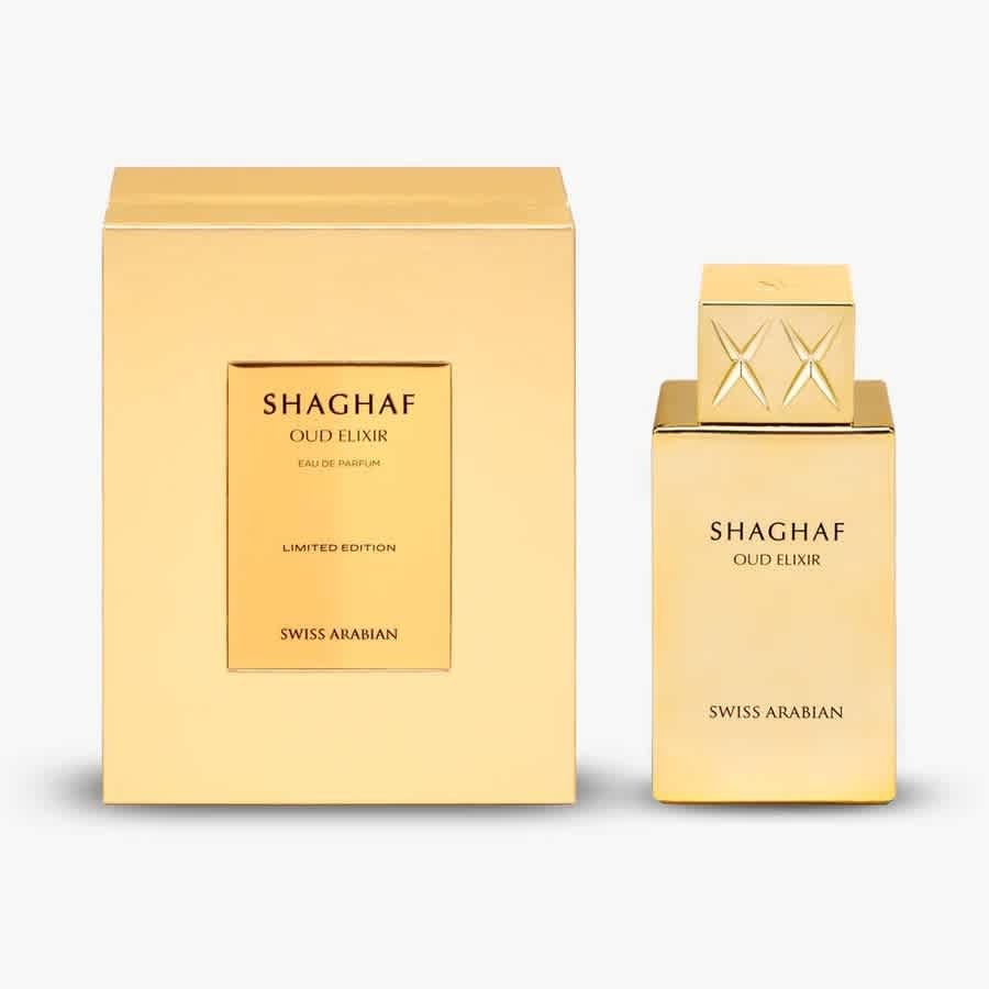 Launch year: 2024. Fragrance Family: Amber Woody. Top notes: Oud, Pink pepper, Saffron. Heart notes: Praline, Oud, Rose, Sage. Base notes: Oud, Vanilla, Amber, Musk. Design house: Swiss Arabian. Design house category: middle eastern fragrance. Scent name: Shaghaf Oud Elixir. Gender: Unisex. Category: Fragrance. SubType: EDP Spray. Size: 2.5 oz. Swiss Arabian Unisex Shaghaf Oud Elixir EDP Spray 2.5 oz