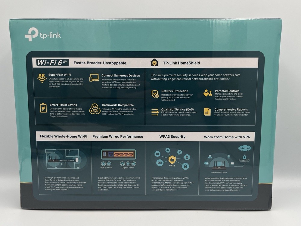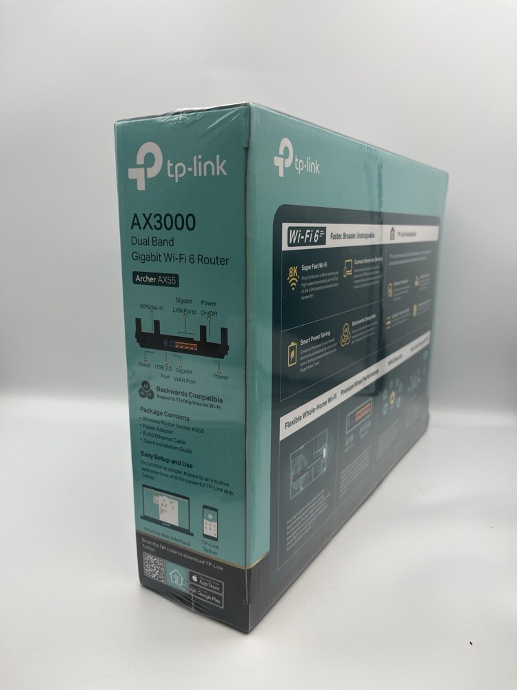 TP Link Archer AX55 AX3000 Dual Band Gigabit Wi Fi 6 Router presented new and factory sealed in original retail packaging, featuring next generation AX3000 wireless performance engineered for high device density, low latency streaming, and modern smart home environments. Designed with four high performance external antennas, OFDMA efficiency, WPA3 security protocol support, and EasyMesh compatibility, this unit delivers stable whole home coverage alongside gigabit wired performance and USB 3.0 connectivity for network storage sharing. The Archer AX55 represents TP Link’s widely adopted mid tier Wi Fi 6 platform, balancing speed, reliability, and long term usability in a clean, understated hardware design suitable for both home offices and media heavy households. Packaging shows normal shelf handling wear consistent with retail storage. Please see photos for exact condition to ensure item meets buyer expectations.
