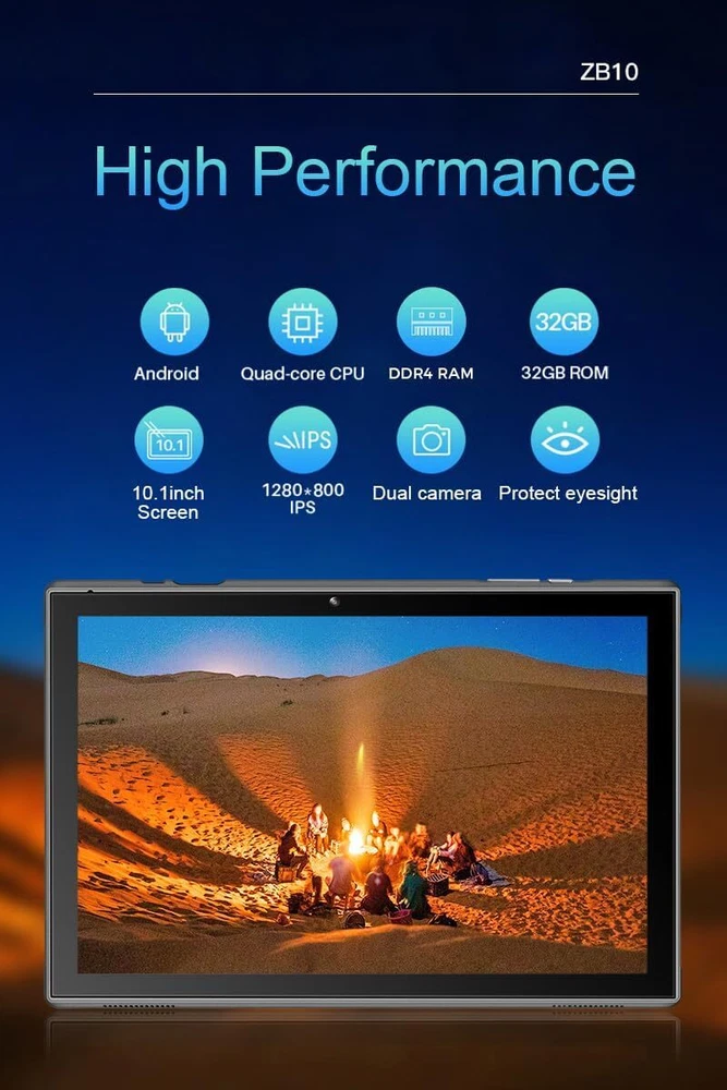 Tablet 10 inch Android Tablet PC, 10.1" Android 14 Tablets, DDR4 6GB RAM 32GB ROM 2MP+8MP Dual Camera, WiFi-6 Bluetooth 1TB Expand IPS Full HD Display Tab, 6000mAh Battery Powerful Performance Tablet Product Details Brand: ZZB Model Name: ZB10 Memory Storage Capacity: 32 GB Screen Size: 10.1 Inches Display Resolution Maximum: 1280*800 【Android 14.0 & High Performance CPU】 ZZB ZB10 tablet is equipped with high performance CPU, adopting the Android 14.0 system with AI , all functions have been strengthened to next level, and can be operated even more swiftly. And with RAM: 6GB(Including 4GB of extended memory) ROM: 32GB, you can feel the smooth operation. Perfect for watching videos, learning tools, and reading e-books. 【IPS Display & Dual Camera】10.1 IN HD tablet equipped with high resolutionof 10.1-inch 1280*800 IPS display. Sizing up to 10.1 inches, you get more space, best choice for movie and video viewing and site browsing. In addition, there is a "reading mode" to reduce harmful light to the eyes so you get to enjoy a comfortable night reading. It has dual cameras (8 megapixels on the rear and 2 megapixels on the front) for taking amazing photos and video chatting. 【1024GB Memory & Large Capacity Battery】 The Android tablet comes with 32GB of built-in storage and up to 1TB of expandable microSD card storage for even more space. In addition, the built-in 6000mah battery can be used for a long time. You can download many movies, e-books and music. A single charge of the battery can last up to 12 hours which makes it an attractive tablet. 【GMS Certification Complete 】Tablets With certification of GMS and pre-installed play store supports Facebook, Twitter, YouTube, Tiktok, Line, Instagram and other trendy social apps, Support Office Software. 【Ideal Choice For Gift】 This Android 14.0 tablet has excellent performance, stylish appearance, and elegant packaging, making it the perfect choice for Christmas, Valentine's Day, birthday, and bar mitzvahs.