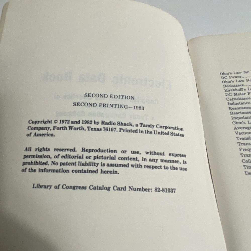 Book Title: Electronics Data Handbook Publication Year: 1983 Author: Radio Shack Format: Paperback Book Series: DATA HANDBOOK gtin13: N/A ISBN: N/A Topic: Electronics Genre: Engineering & Technology Language: English Publisher: Tandy Corporation
