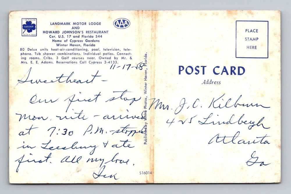 Tarjeta postal vintage de Winter Haven FL-Florida, Landmark Motor Lodge, restaurante
