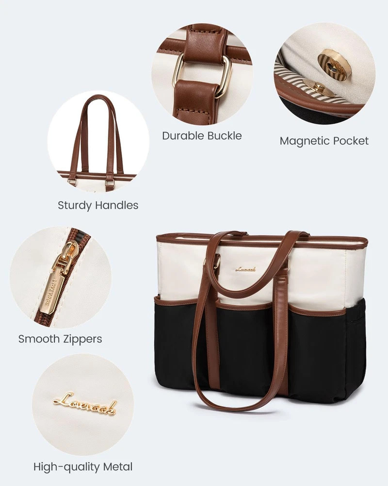 Multi-pocket Design for Versatile Use: Our work tote bag for women boasts 10 interior pockets, making it perfect for organizing your work essentials. Whether you're a nurse, teacher, or professional, this tote bag ensures everything has its place. Durable and Waterproof: Built to withstand daily use, this laptop bag for women features strong, waterproof materials that keep your items safe in any weather, ideal for work or weekend travel. Enhanced Security: The fully enclosed zipper top of the laptop tote bag for women offers maximum security, preventing items from falling out and keeping them dry in the rain. Perfect for both professional and casual settings. Stylish and Functional: With elastic side pockets that can hold large water bottles, this work tote bags for women combines style and function, ensuring you look good while staying prepared for any situation. Perfect for Various Scenarios: This bag is ideal not just as a work bag, but also as a teacher bag, nurse bag, gym bag for women, diaper bag, computer bags for laptops for women, everything tote bag, travel tote bags for women, or beach tote. Its stylish design makes it great gifts for teachers, working women and busy moms alike. Product Description Teacher Tote Bag This tote bag, with its multiple pockets and large capacity, is perfect for teachers' daily needs. It can hold many books and teacher essentials, making it an excellent Teacher's Day gift. Nurse Bag As a nurse bag, it features multiple pockets and ample space, perfect for carrying nurse essentials for work during daily hospital shifts. An ideal gift for nurses. Travel Tote Bags for Women This travel tote bag with a luggage sleeve is perfect for vacations and business trips. It ensures easy airport navigation and convenient carrying. Laptop Bag for Women Work This work bag for women features a dedicated laptop compartment, perfect for professional use. Stylish, functional, and ideal for the office or meetings. Diaper Bag This diaper bag tote features organized compartments, perfect for outdoor activities. It's stylish and practical for carrying baby essentials during outings. College Book Bag This laptop tote bag features a spacious design, perfect for carrying books and laptops. Ideal for college life, library visits, and daily classes.