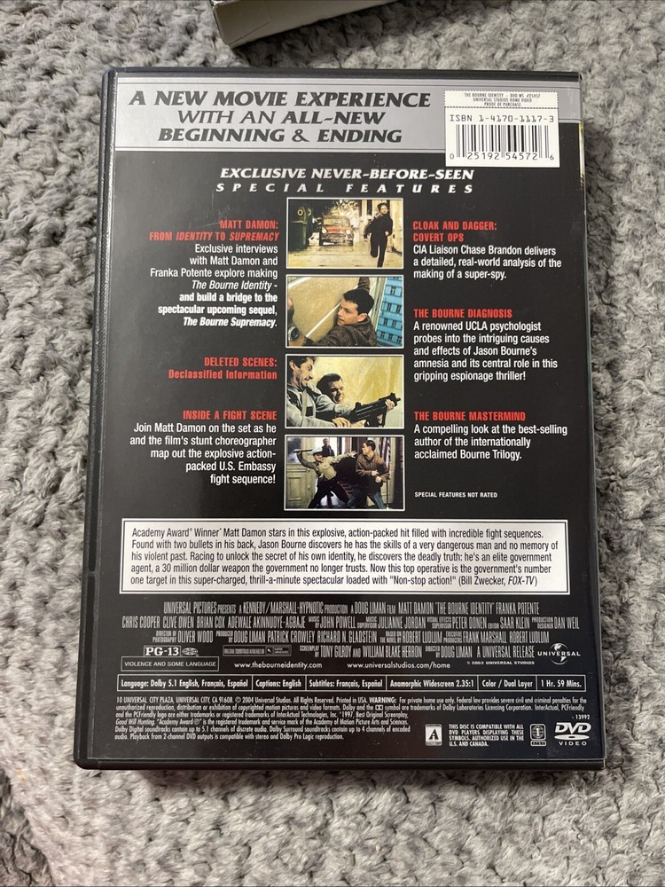 The Bourne Identity (Widescreen Extended Edition) DVDs is an action-packed adventure movie featuring Matt Damon and Franka Potente. Released in 2004, this movie is rated PG-13 and directed by Doug Liman. The DVDs come in the DVD format and feature widescreen display. This extended edition is a must-have for fans of the Bourne franchise, with its explosive action and thrilling plot twists. The movie takes you on a journey of identity and redemption, as Bourne seeks answers to his past and fights to save the world from destruction. Get your hands on this DVD set and experience the ultimate adventure.