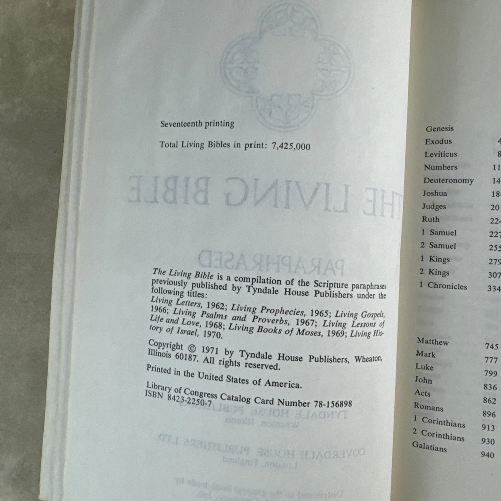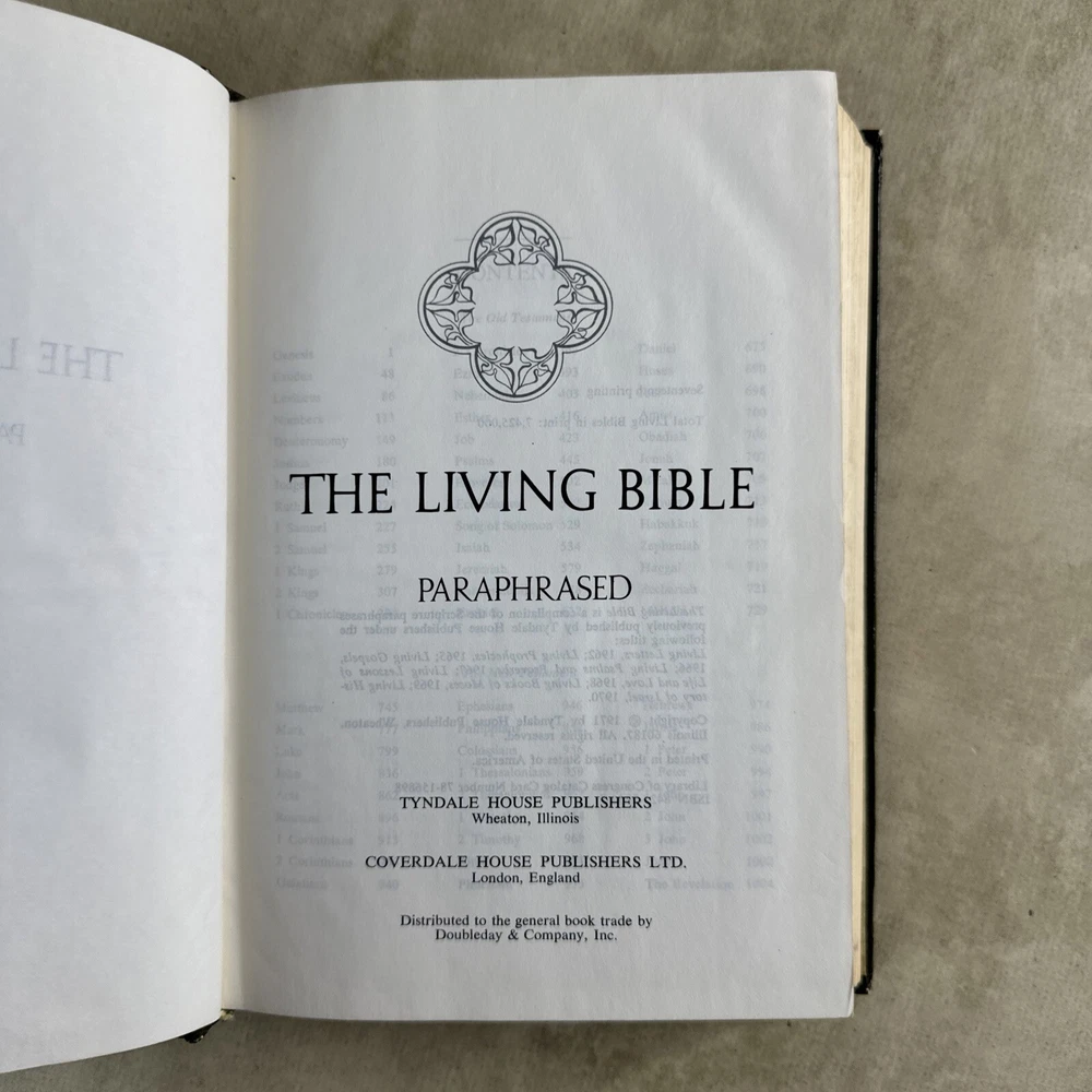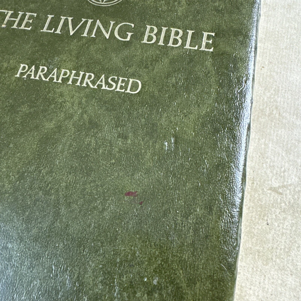 Publisher:Tyndale HouseLanguage:EnglishSigned:NoTopic:Catholicism, Christianity, Jesus Christ, Religious HistoryFormat:Faux LeatherISBN:Does not applyBook Title:The Living BiblePublication Year:1973Features:Large PrintPersonalize:NoGenre:Religious & SpiritualEx Libris:NoBook Series:NAOriginal Language:EnglishType:Prayer BookNarrative Type:NonfictionIntended Audience:Young Adults, AdultsAuthor:TyndalePersonalized:NoVintage:YesCountry/Region of Manufacture:United StatesInscribed:Nogtin13:Does not apply