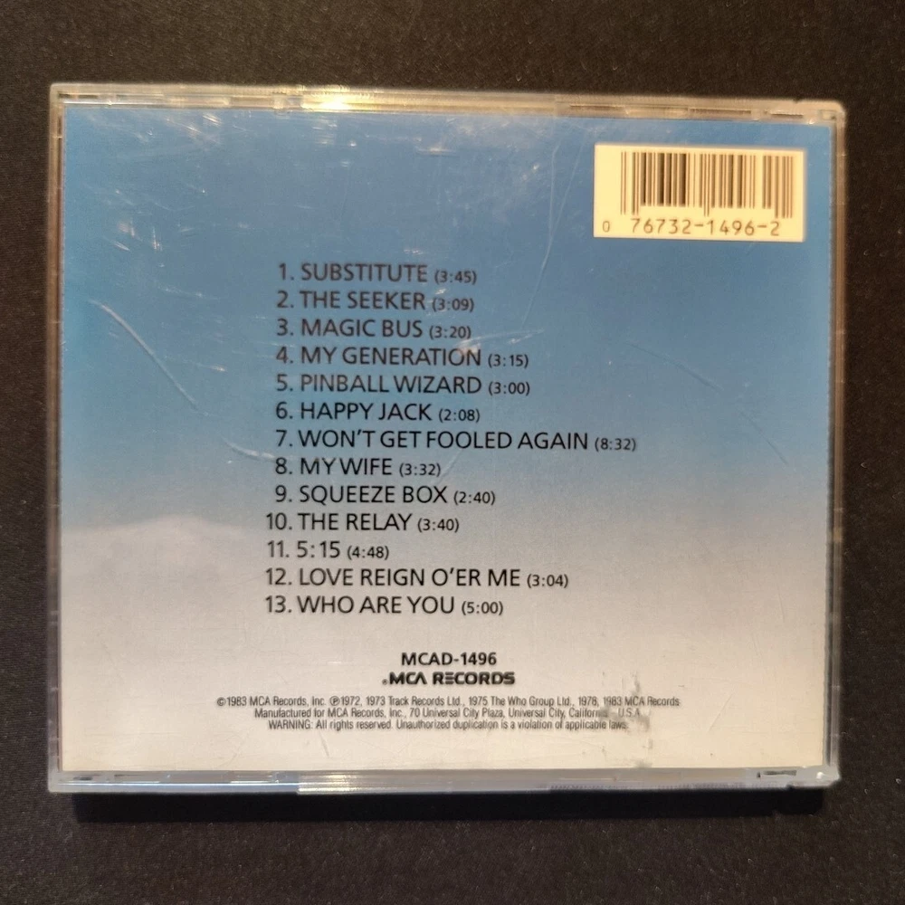 The Who's Greatest Hits is a must-have album for any fan of classic rock. This CD, released in 1983 by MCA Records, features a compilation of the band's greatest hits. The jewel case is standard size and the CD grading is excellent (EX). The inlay condition is also excellent (EX) and the catalog number is MCAD-1496. This album is a club edition and was released in the United States. The Who's Greatest Hits is a rare find and a perfect addition to any music collection.