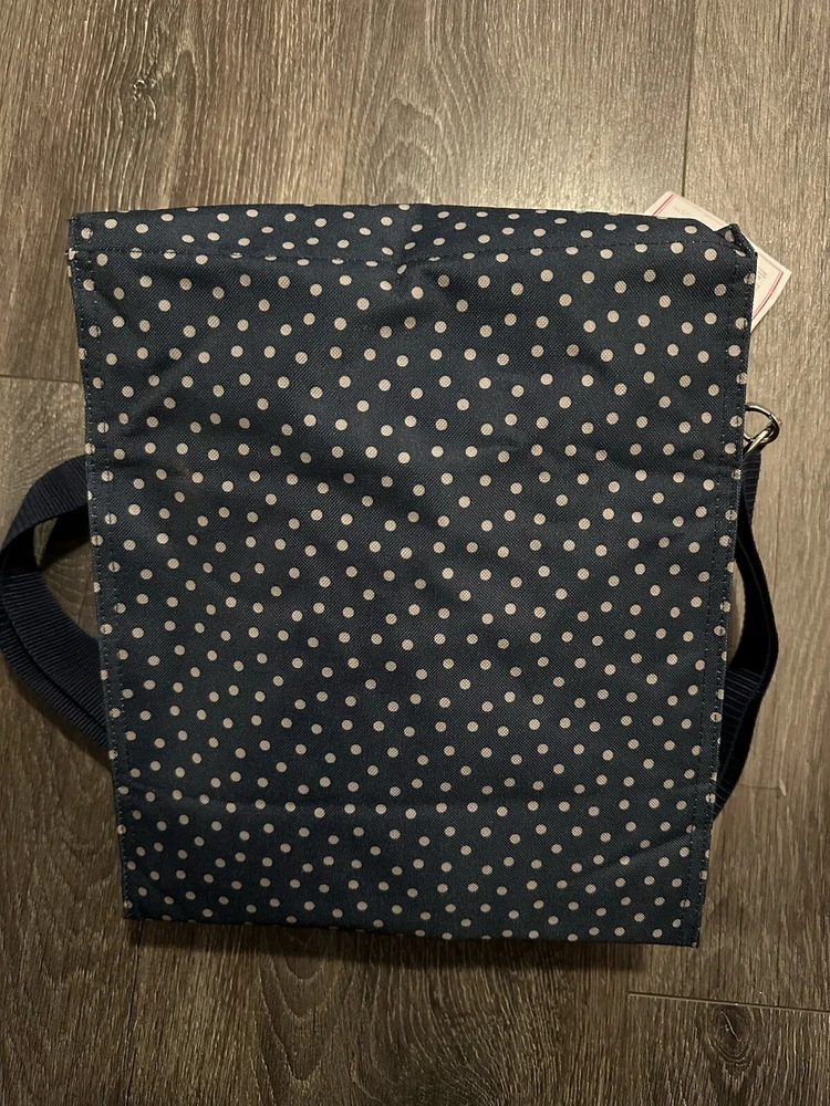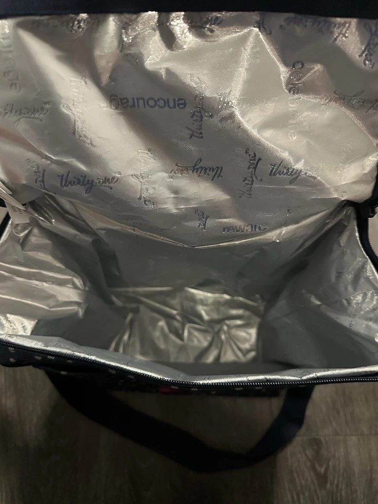 This Thirty-One Lunch tote bag is perfect for a day at the beach or a picnic in the park. The bag is designed with a blue exterior color and features an etched shells letter "B" design. It has a zip closure and measures 12 inches in width, 13 inches in height, and 7 inches in depth. The bag is made of polyester and has a nylon handle/strap material in blue color. The tote bag is insulated and has a gray lining color. The product line is Thirty-One Lunch and it is a medium-sized bag.