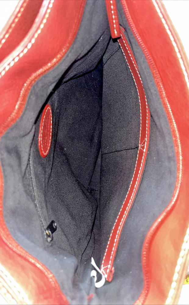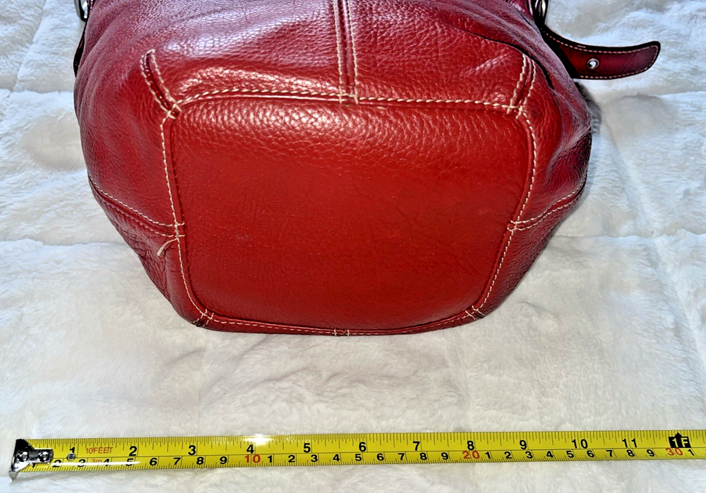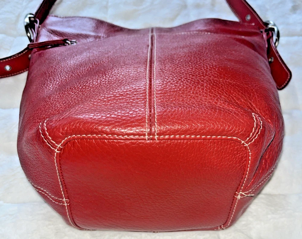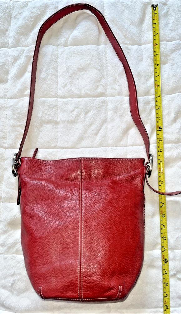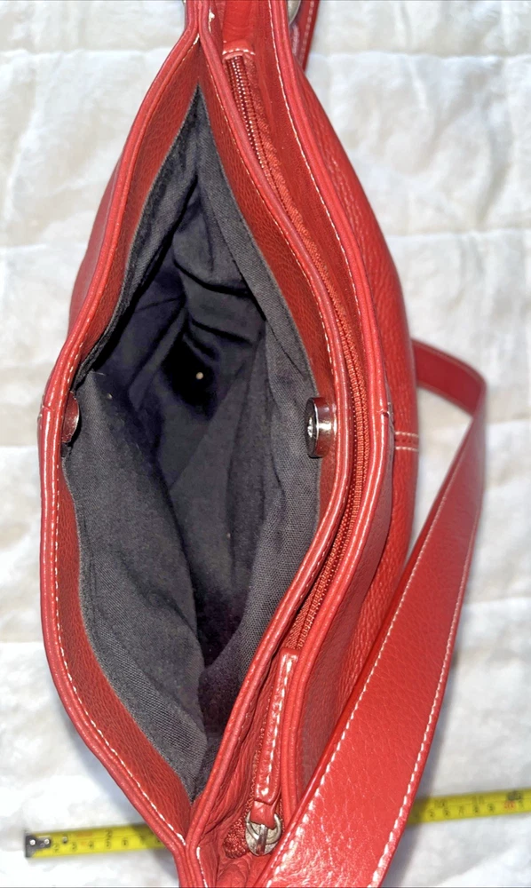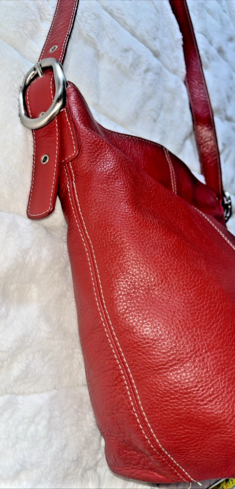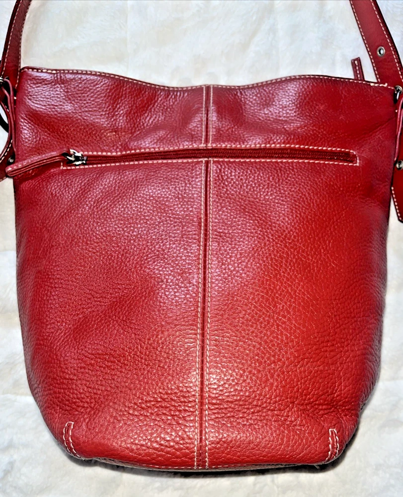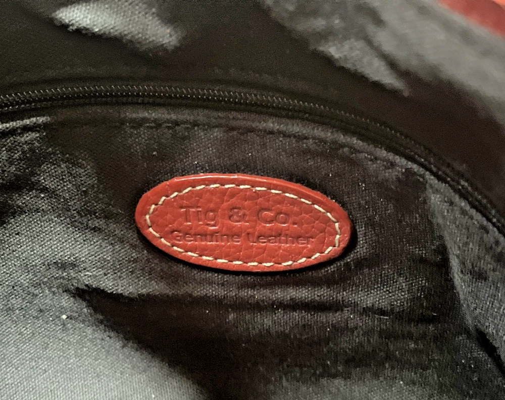 The Tig & Co Genuine Leather Crossbody purse by Tignanello is a stylish and versatile accessory for women. Made from high-quality leather with a solid exterior color of red and silver hardware accents, this medium-sized purse features a zip closure and adjustable crossbody strap for added convenience. The classic design includes a lined interior with inner and outer pockets, making it perfect for daily use in a casual or crossbody style. Crafted with attention to detail, this purse is a timeless addition to any wardrobe.