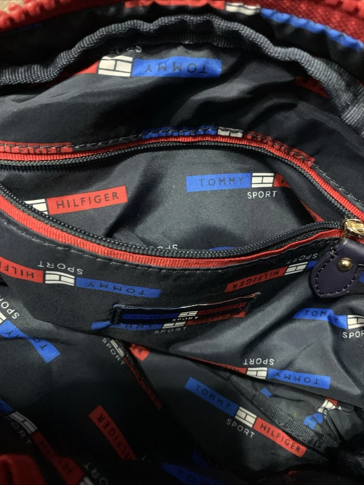 This set of two Tommy Hilfiger Sport Travel Tote Bags is a must-have for any stylish and practical traveler. These bags feature a classic designer pattern with the iconic Tommy Hilfiger logo in red, white, and blue. The bags are made of high-quality canvas material and come with double handles and a crossbody strap for easy and comfortable carrying. The bags have a zip closure and are lightweight, making them perfect for travel. They also feature inner pockets and a navy lining with logo, ensuring that your belongings are safe and organized. With their medium and small sizes, these tote bags are perfect for any occasion and are sure to make a statement wherever you go.