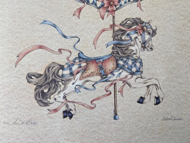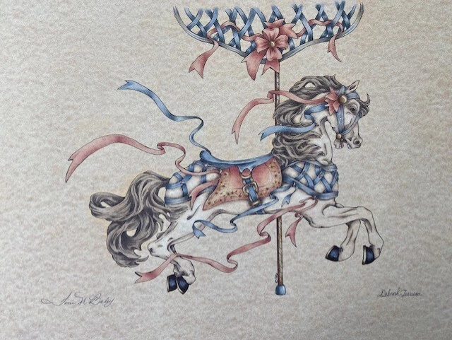 A unframed print by Toni M. Baley and Deborah Ferrusa of a Carousel Horse. Perfect in a nursery for a boy or girl. Frame and matting not included. You can have it framed with your choice of pink or blue border matting and choice of frame. Will ship to insure un-damaged delivery. Picture measures11x14 outside dimension. Picture is actually 9.3/8 w x 10.1/4