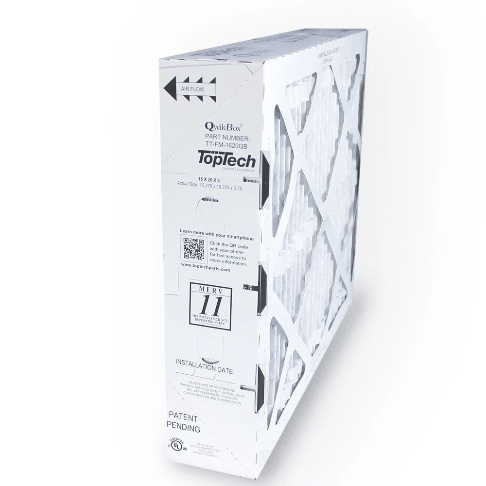 These high quality original equipment filters are designed for the TopTech and TechPure TT-MAC-1722 air cleaner. These filters have a MERV 11 efficiency rating. The new QwikBox collapsed design provides for less chance of shipping damage and takes up less space so it is more convenient to keep spare filters on hand. Assembly required. New QwikBox Collapsed Design That Is Easy To Assemble Prior to Installation MERV 11 TopTech TechPure OEM Original Equipment Replacement Air Filter Fits TechPure TT-MAC-1722 Air Cleaner Assembled Size 15.375 x 19.375 x 3.75