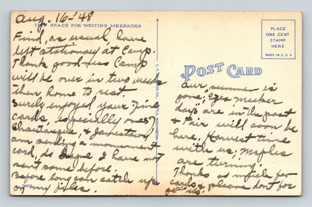 Original/Licensed Reprint: Original Unit of Sale: Single Unit Continent: North America Circulated: Yes Type: Printed (Lithograph) Era: See Postcard Scan Subject: See Postcard Scan Country: See Postcard Scan Region: See Postcard Scan Postage Condition: Unposted Theme: Cities & Towns City: See Postcard Scan Country/Region of Manufacture: Unknown City/Region: Olympic National Park