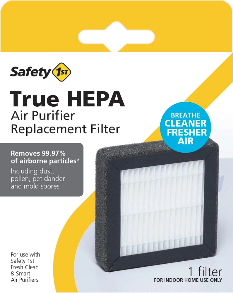 True HEPA filters 99.97%* of airborne particles Filters out pollen, dust and pet dander Compatible with Safety 1st Fresh Clean & Safety 1st Smart Clean Air Purifiers When it’s time to change your filter, make sure that you always have a replacement ready. The Safety 1st True HEPA Replacement Air Purifier Filter removes 99.97% of airborne particles*, so there is less dust, pollen and pet dander in the air. With less contaminants in the air your child’s nursery, or any room where you place the air purifier, will have cleaner and fresher air to breathe. How do you know when to change your filter? When the cumulative use time of the filter reaches 1000 hours, the startup night light flashes for 1 minute, and the single flashing dark gradient cycle is 2 seconds. The filter replacement timing is based on usage. For instance, 1000 hours would equate to about 90 days with daily usage of 11 hours, while 24 hours of continuous usage would require a filter change sooner. *Filter removes 99.97% of airborne particles sized 0.3 microns and above.
