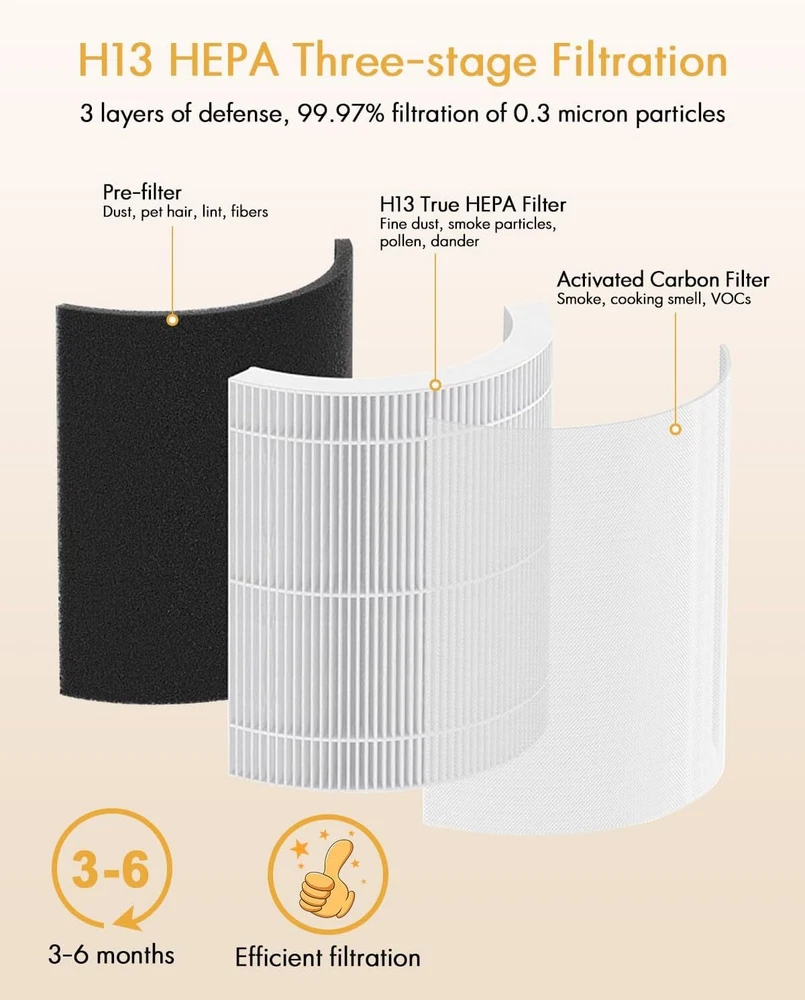 About this item Compatible with Various Models: The MOOKA air purifiers filter replacement is designed to fit multiple air purifiers models, like the MOOKA B-D02L air purifiers, the B-D02L air cleaner, the VEWIOR B-D02U air purifier for home, ensuring compatibility and versatility Premium 3-Layer Filtration Materials: Crafted with high-quality H13 True HEPA filter, activated carbon filter and a durable pre-filter, the H13 HEPA filter replacement is built to last providing the-lasting purification performance and clean air High Filtration Efficiency: The ture air replacement filters effectively capture up to 99.97% of airborne particles as small as 0.3 microns, including dust, pollen, pet dander, hair, smoke, odors & VOCs Easy to Install: Firstly, open the base cover of the purifier and take the used air cleaner filter out of the purifier. Unpack the new air purifier filter replacement, and then put the new MOOKA air filter replacement into the purifier; Finally, close the base cover of the purifier, and click "Start" to use. Please remember to replace the VEWIOR air purifier filter every 3-6 month. Size of the filter: 5.5 inch x 5.5 inch x 6.3 inch Reliable Support and After-sales Service: We are committed to providing excellent customer support and after-sales service to ensure your satisfaction. If you experience any issues or have any concerns about the air cleaner replacement filters, please feel free to contact the customer service team for prompt assistance
